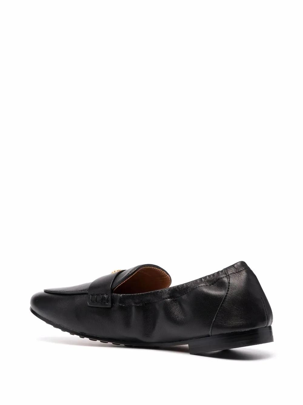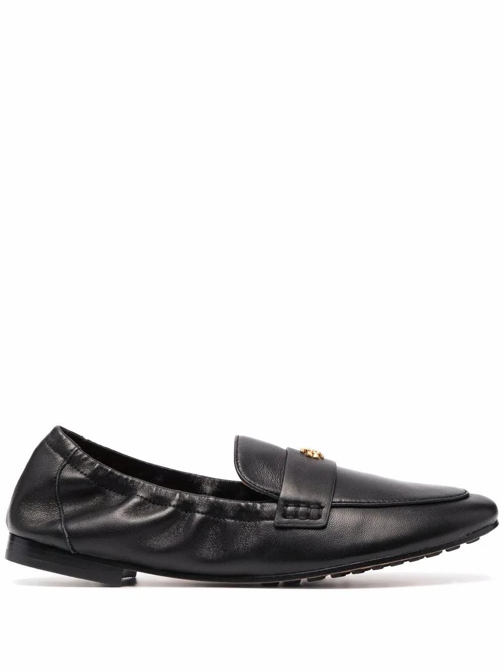Black leather slip-on leather loafers from TORY BURCH featuring slip-on style, gold-tone logo plaque and flat rubber sole.