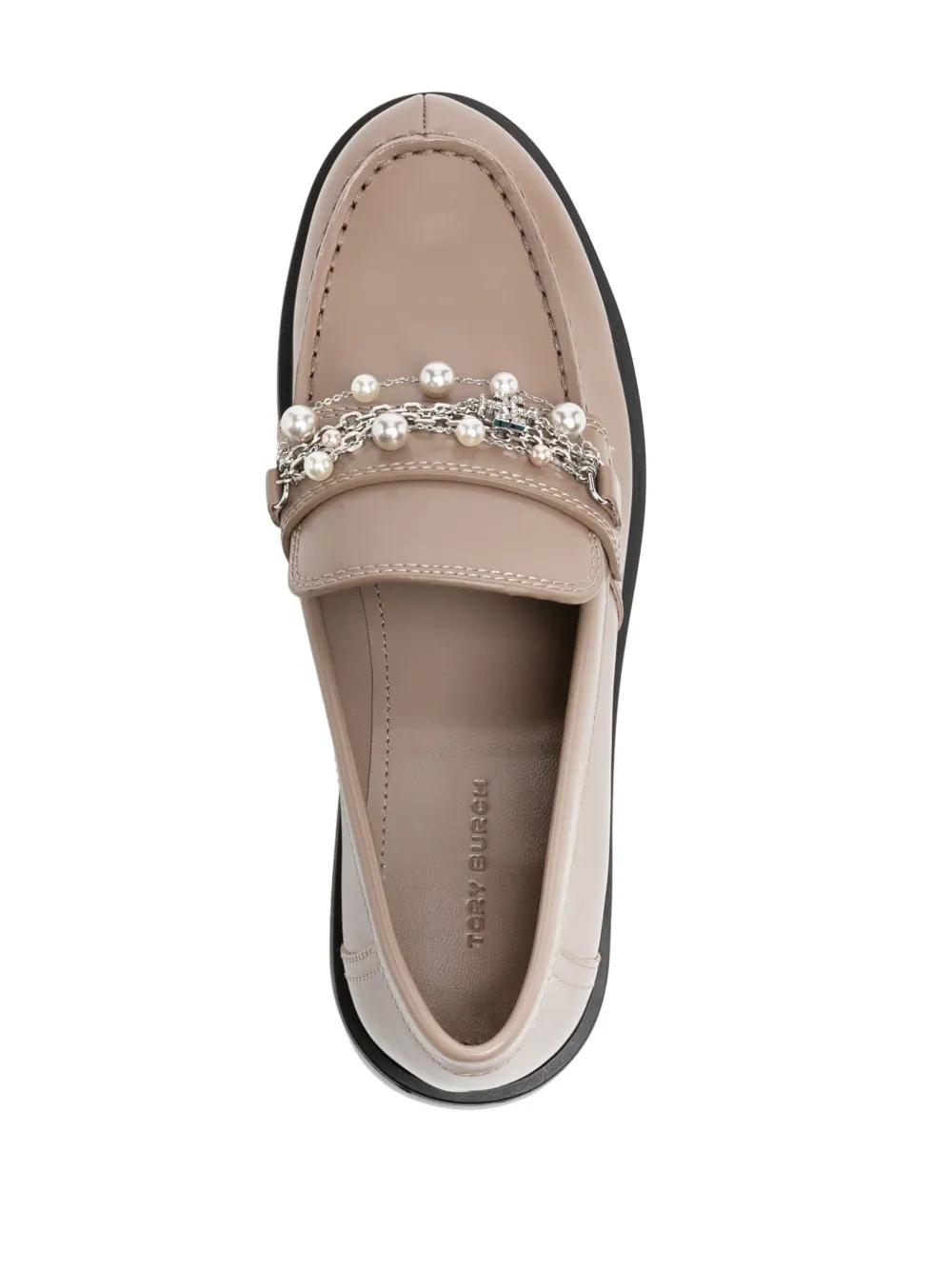 light brown flat rubber sole moc stitching almond toe crystal embellishment