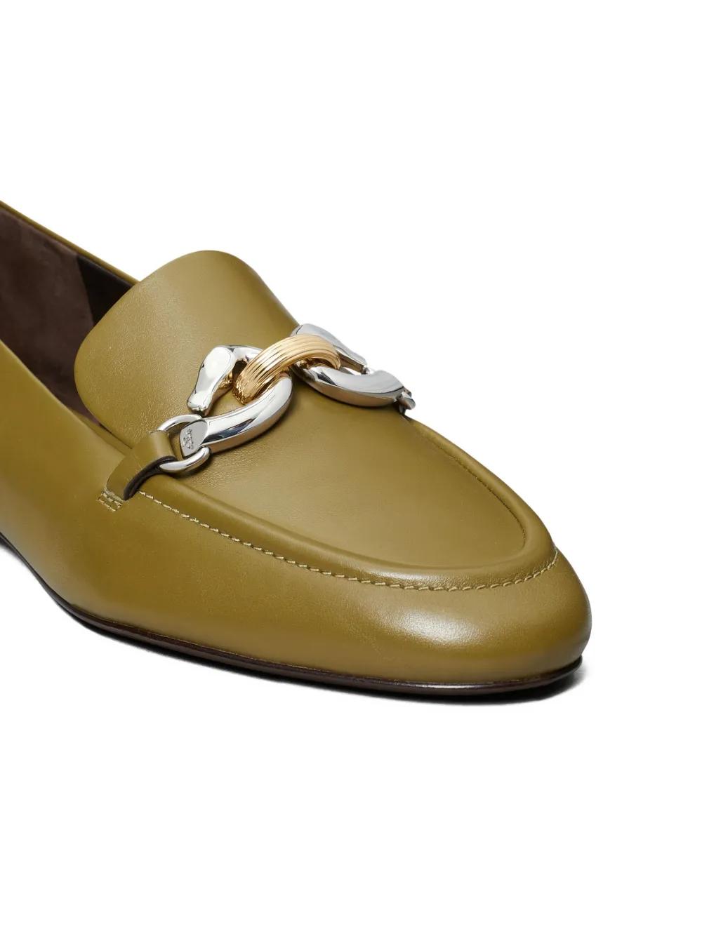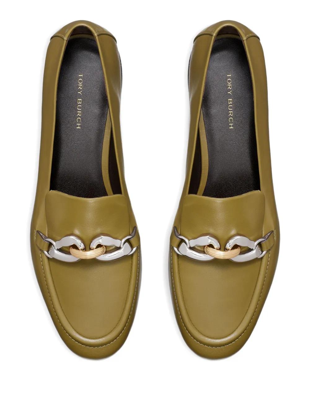 olive green calf-leather upper horsehead detail flat sole almond toe