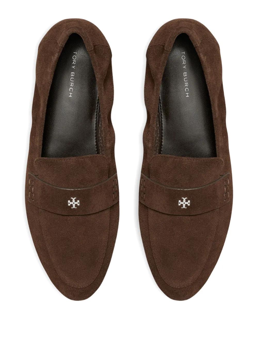 dark brown suede upper leather sole metal logo plaque slip-on style rounded toe