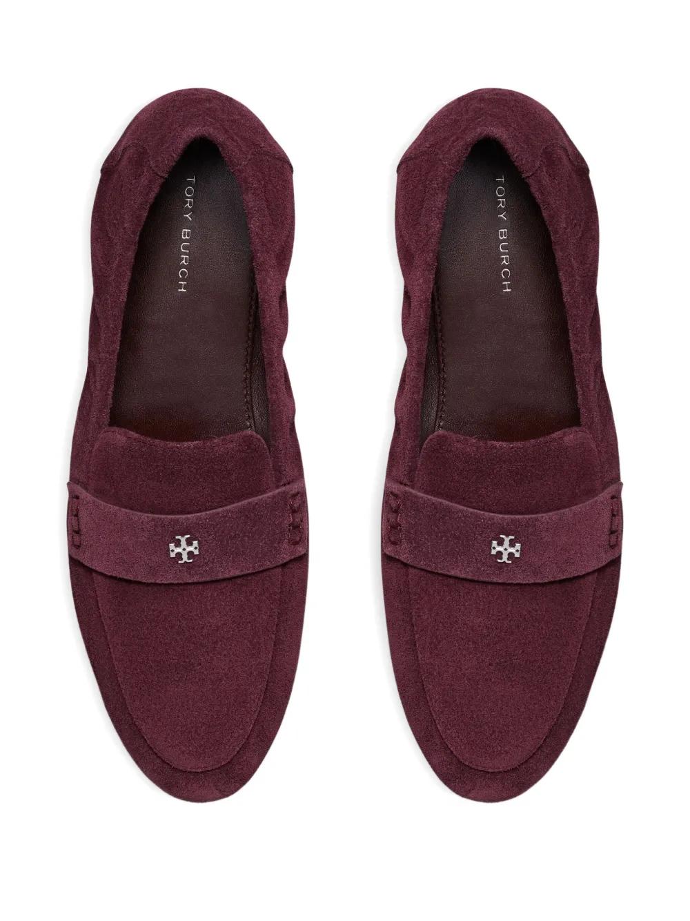 plum suede upper flat sole slip-on style branded metal plaque mocassin toe