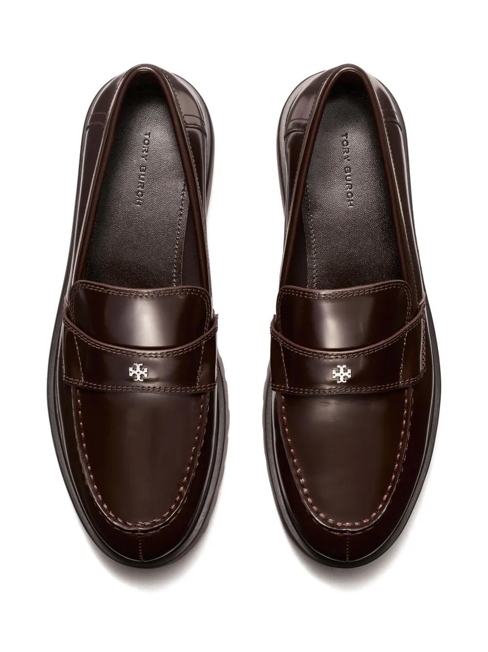 brown leather upper penny strap lug sole metallic logo pointed toe