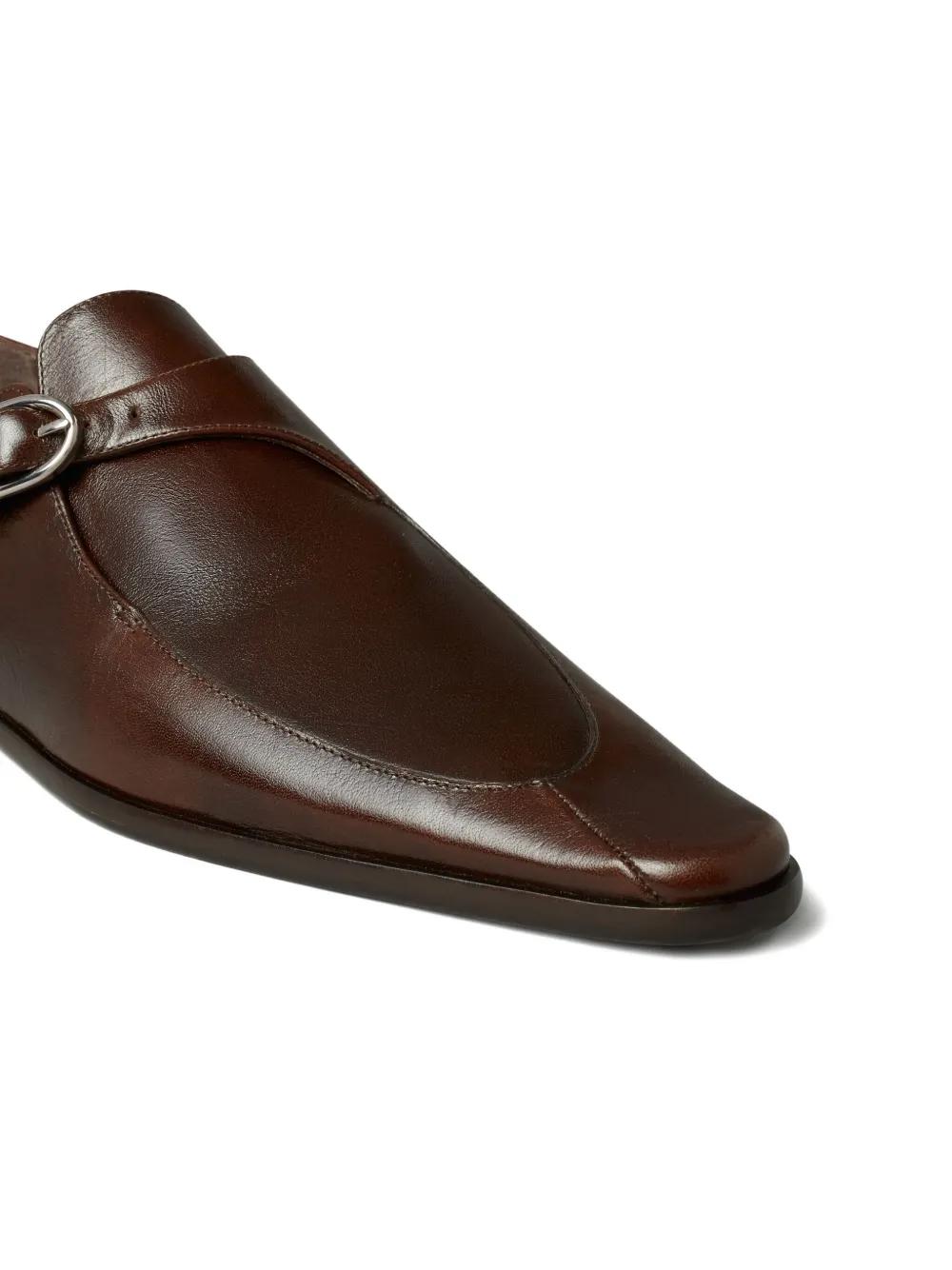 brown buckle detail strap square toe flat sole leather