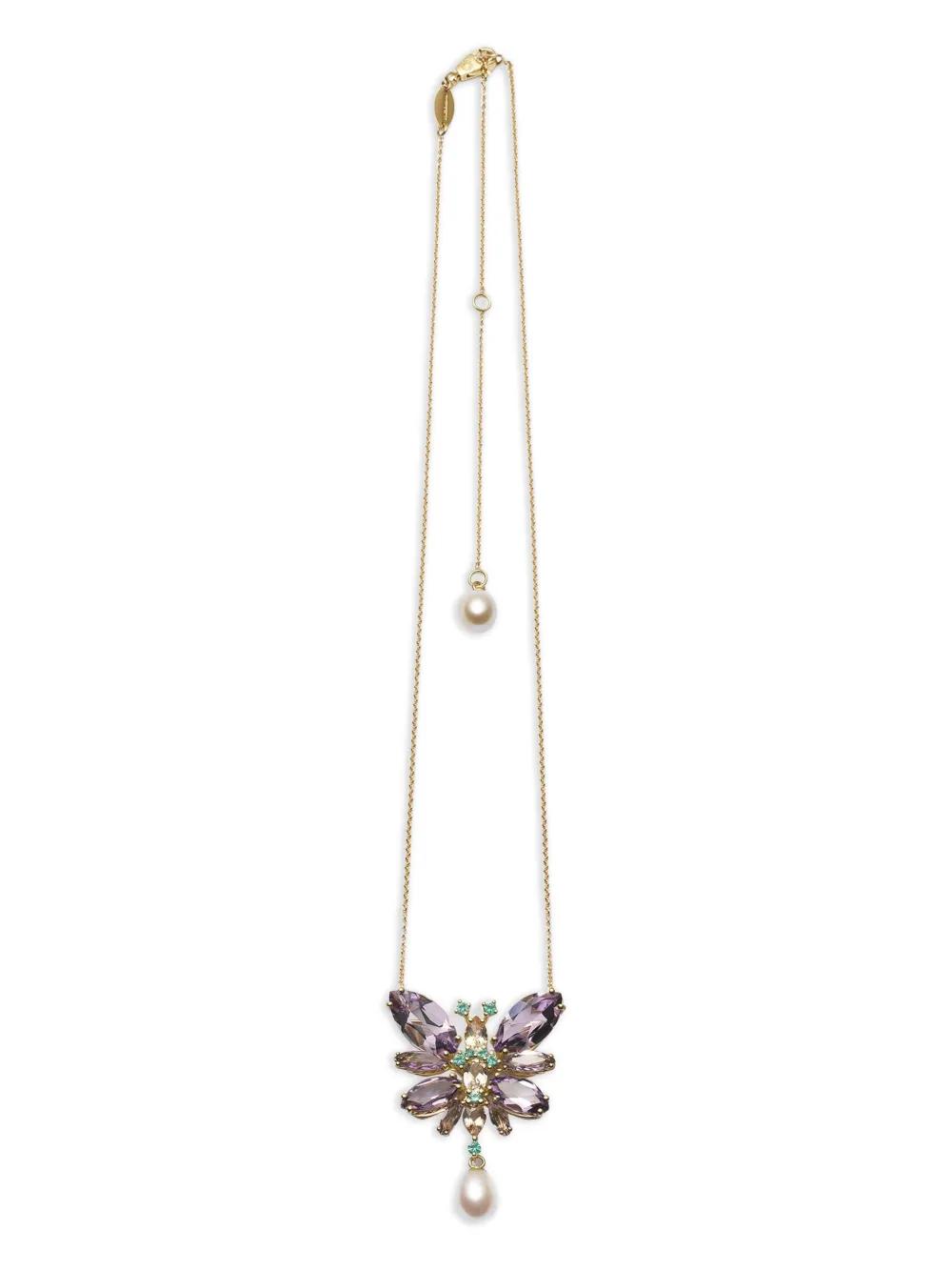 gold-tone 18K yellow gold quartz amethyst morganite emeralds freshwater butterfly pendant design lobster clasp fastening Normal everyday use and external agents may reduce the lustre of gemstones and gold surfaces. To maintain, use specific, non-abrasive products specially meant for cleaning jewellery.