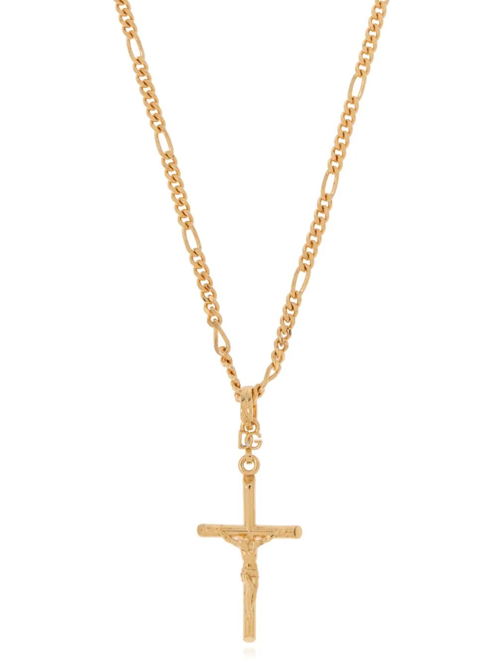 gold-tone brass polished finish cross pendant logo pendant figaro-link chain adjustable fit lobster claw fastening
