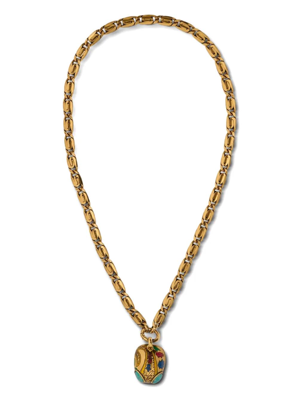 gold curb chain alien-head pendant enamel detailing gemstone embellishments ornate design