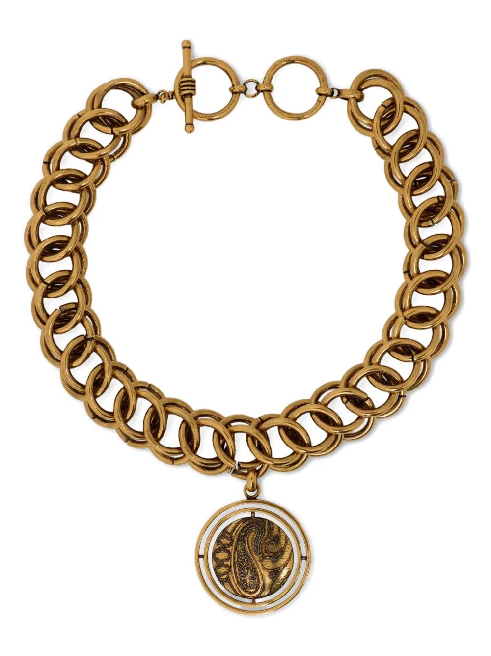 gold chain necklace toggle clasp circular pendant paisley pattern etched detail