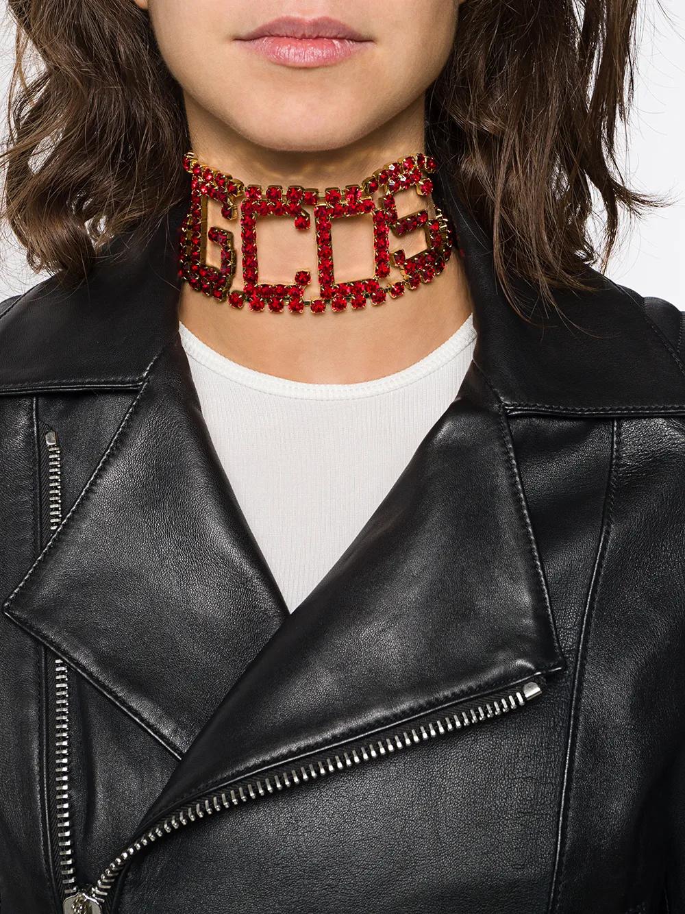 Red metal logo chocker necklace from GCDS featuring a rhinestone logo, gold-tone hardware, an engraved logo charm and a lobster clasp closure.