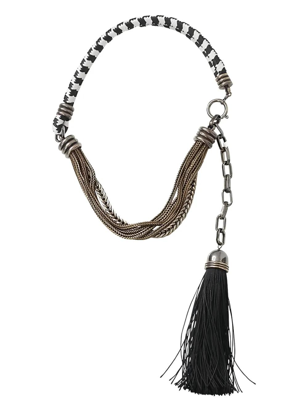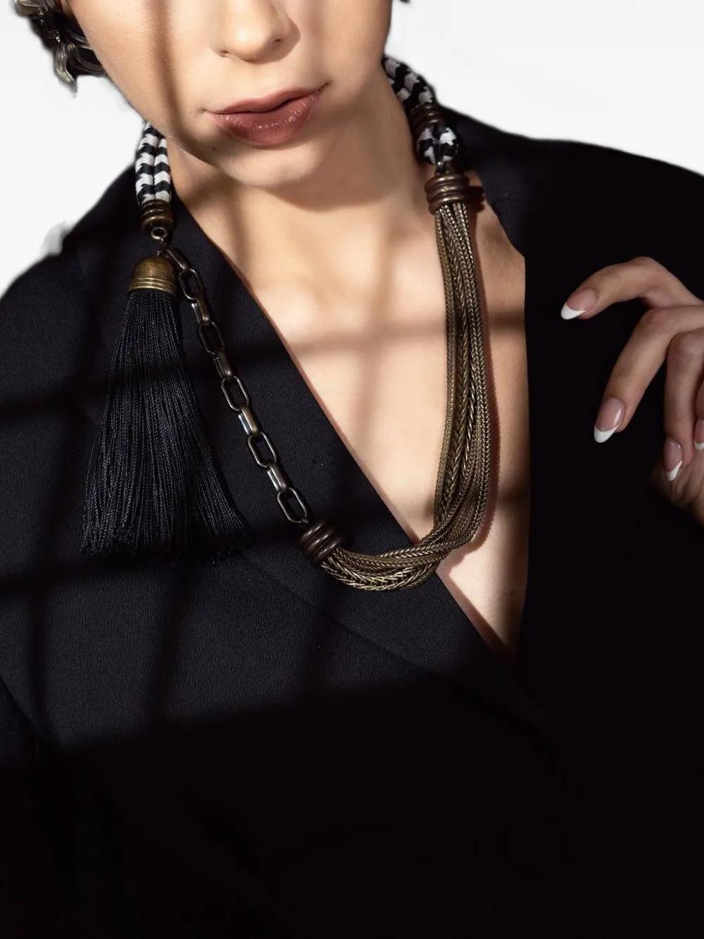 black multiple chain strands tassel embellishment chain detail Normal everyday use and external agents may reduce the lustre of gemstones and gold surfaces. To maintain, use specific, non-abrasive products specially meant for cleaning jewellery.