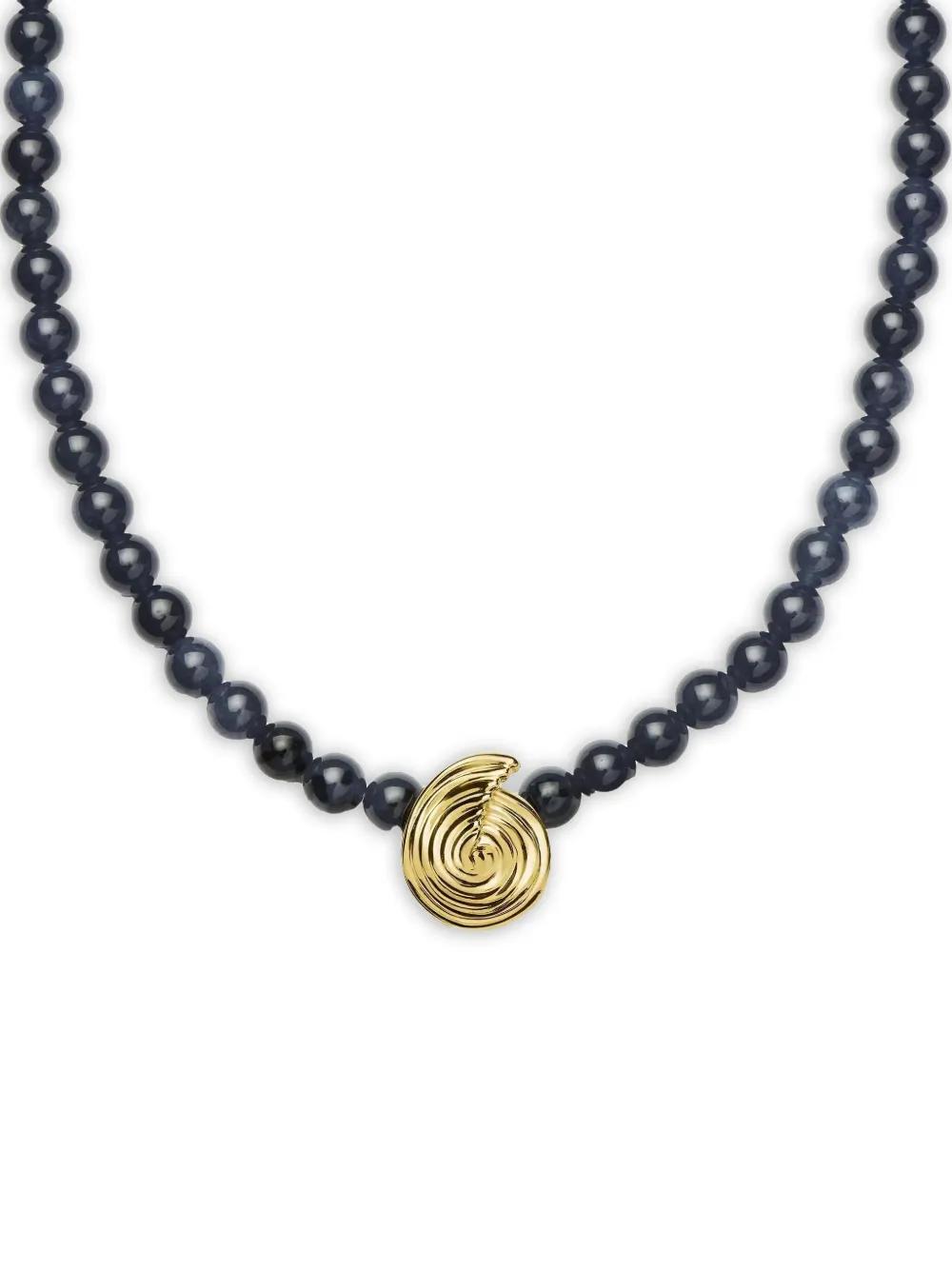 gold-tone and blue quartz spiral pendant beaded chain Normal everyday use and external agents may reduce the lustre of gemstones and gold surfaces. To maintain, use specific, non-abrasive products specially meant for cleaning jewellery.