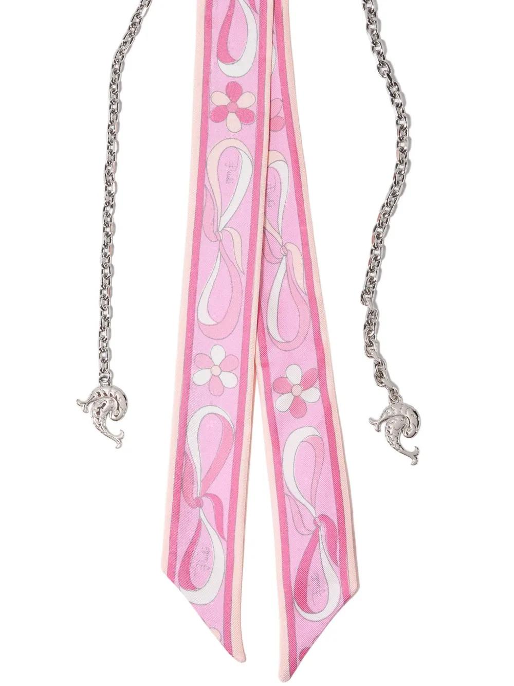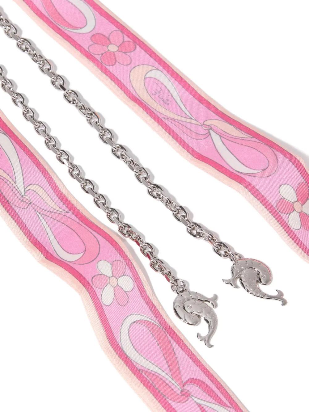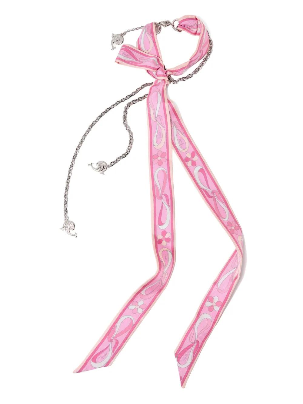 light pink floral pattern chain detail dolphin charm silk band spring ring fastening