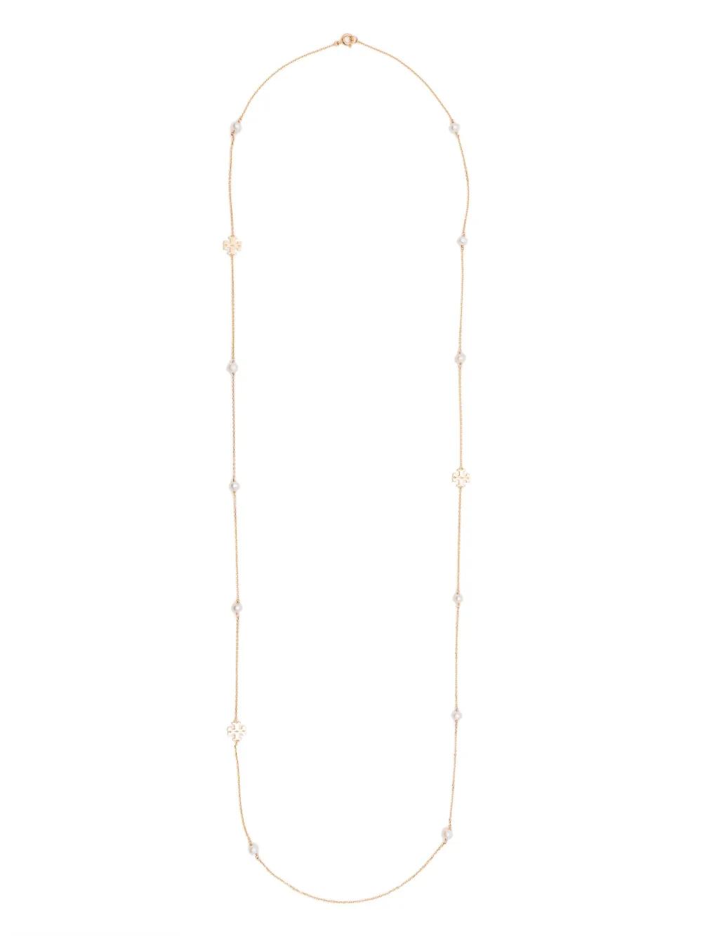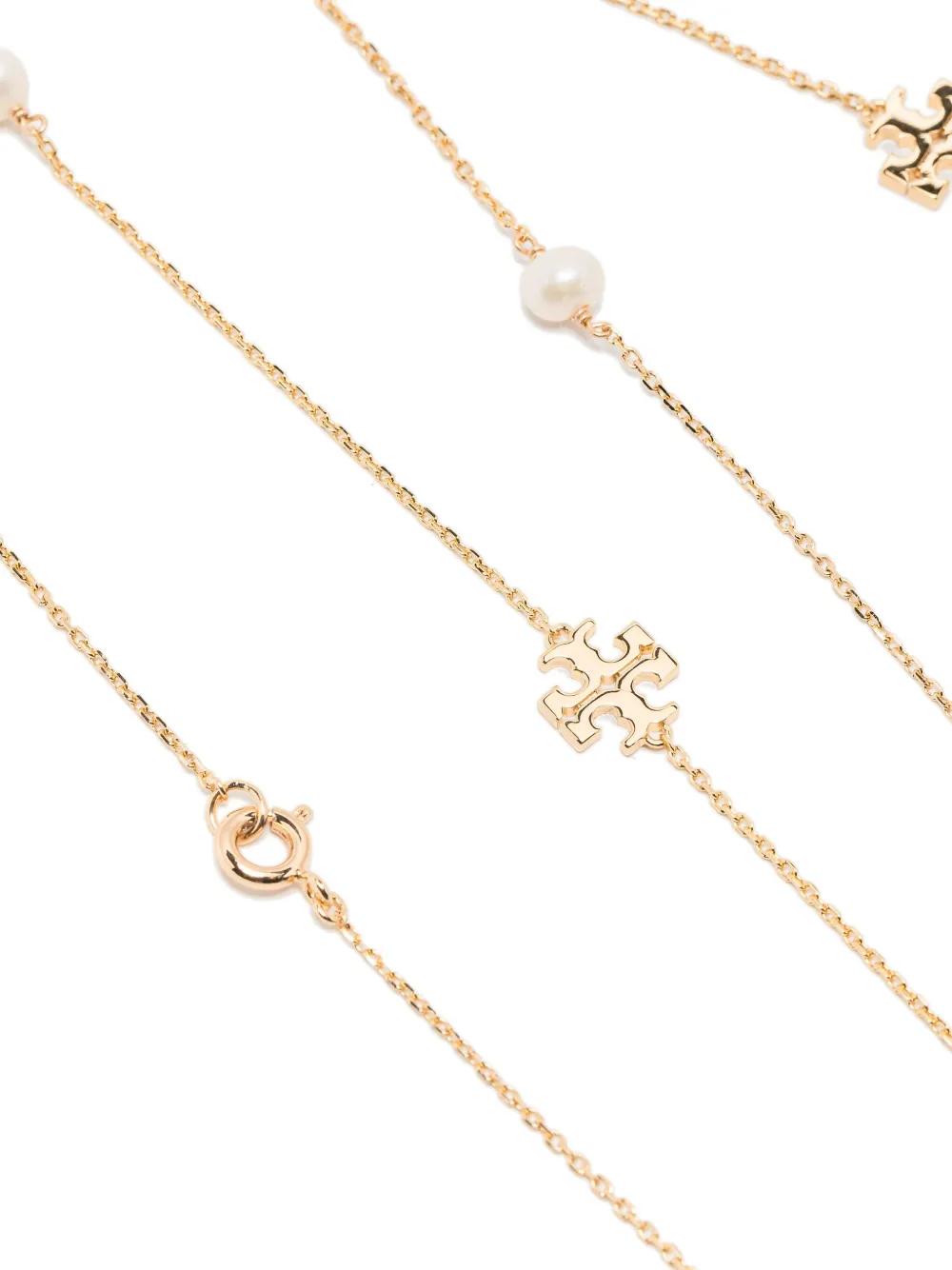 gold-tone 18kt gold plated delicate chain pearl detailing logo charm spring-ring fastening