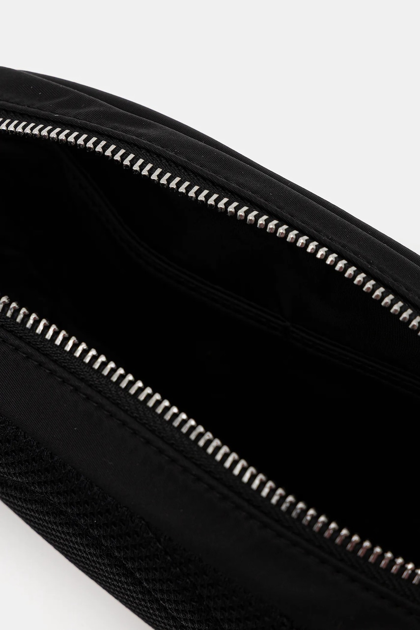 - Całość zapinana na suwak. - Z przodu kieszonka zapinana na suwak. - Liczba wsuwanych kieszeni wewnętrznych: 2. - Nie mieści formatu A4. - Model z podszewką. - Nieodpinany długi pasek z regulacją. - Dołączony tekstylny worek zabezpiecza produkt przed kurzem. - Głębokość: 5 cm. - Wysokość: 14,5 cm. - Szerokość u podstawy: 21 cm.