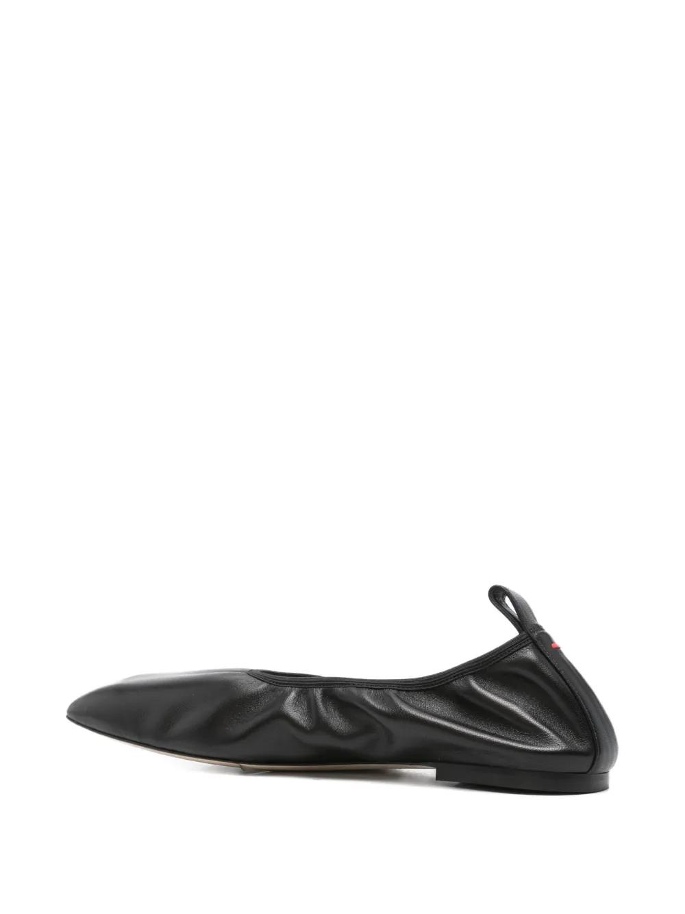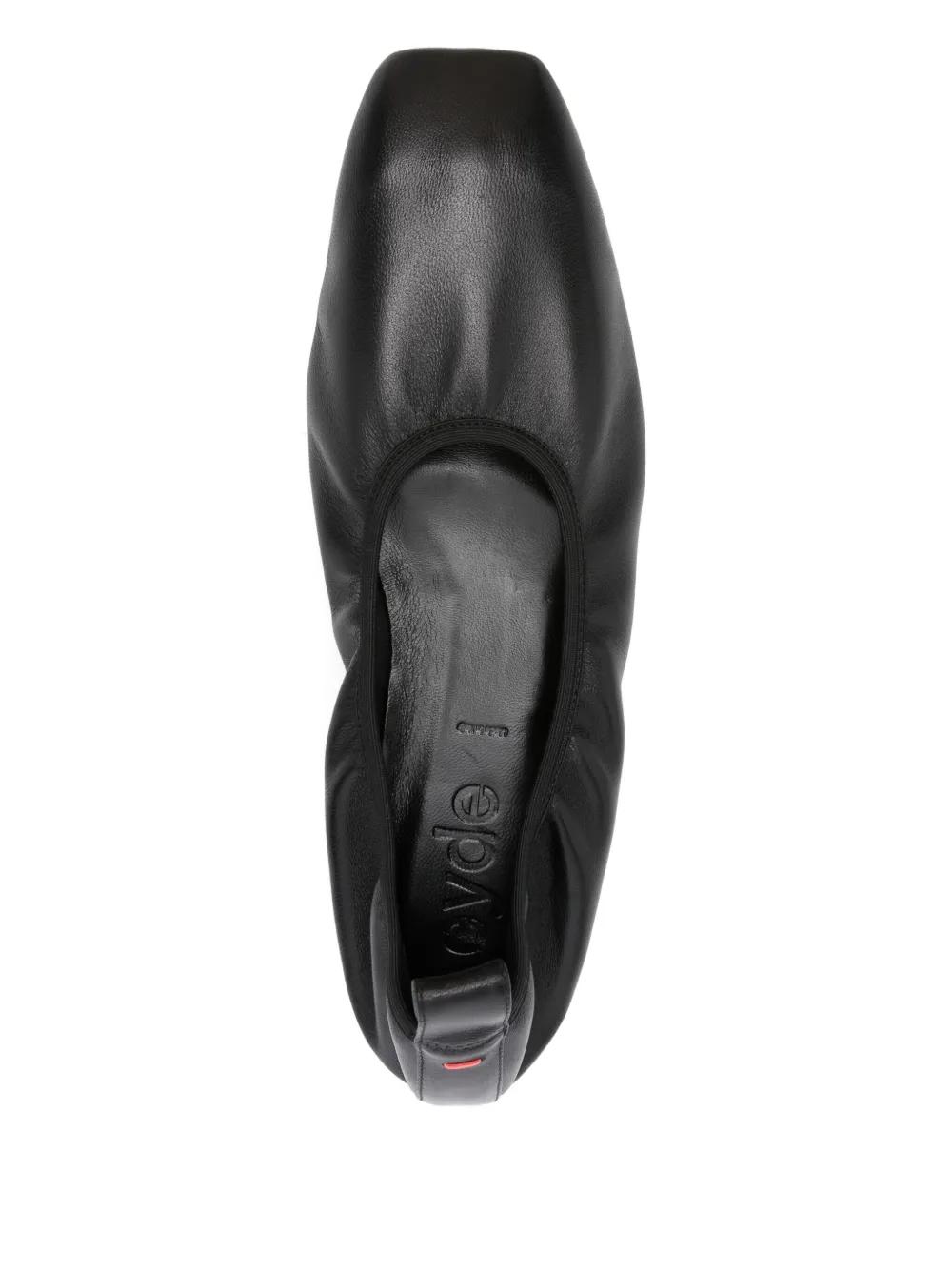 black leather upper elasticated back square toe flat sole pull-tab at the back