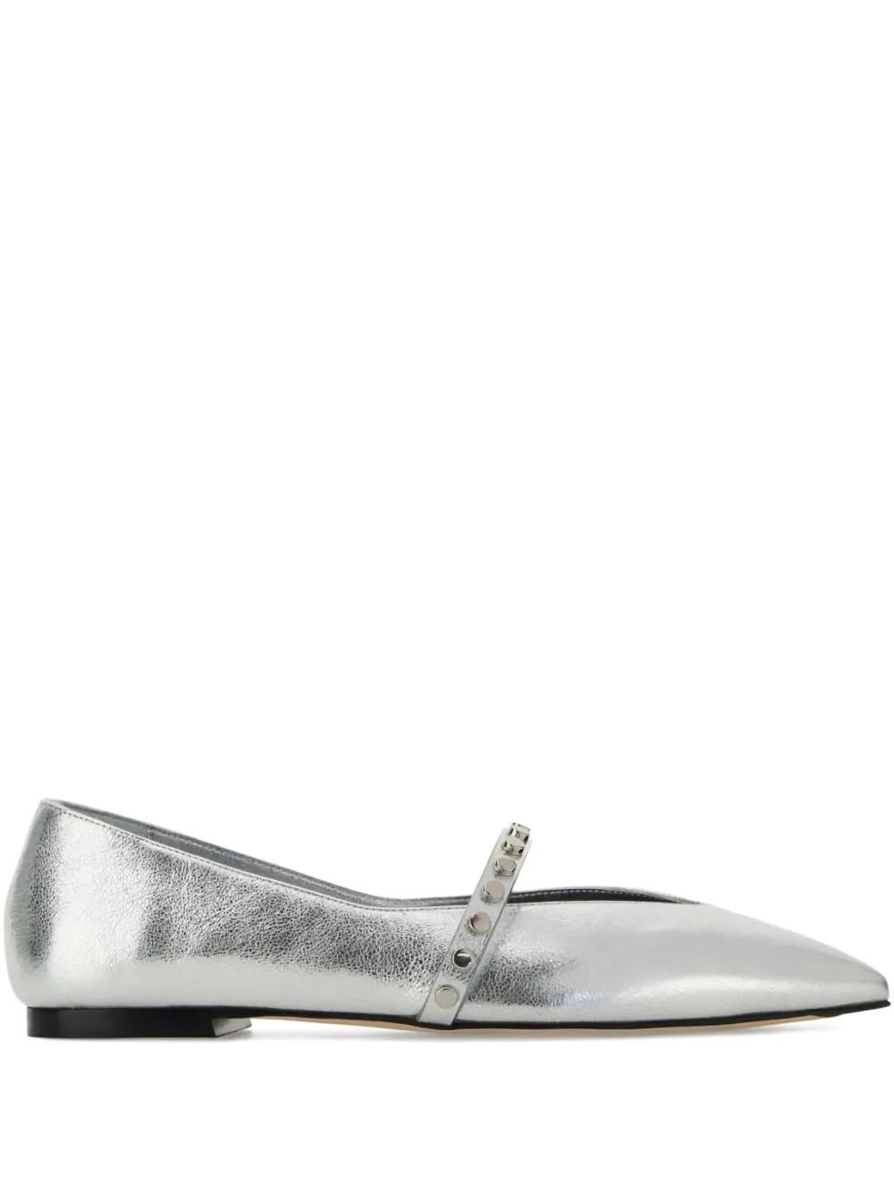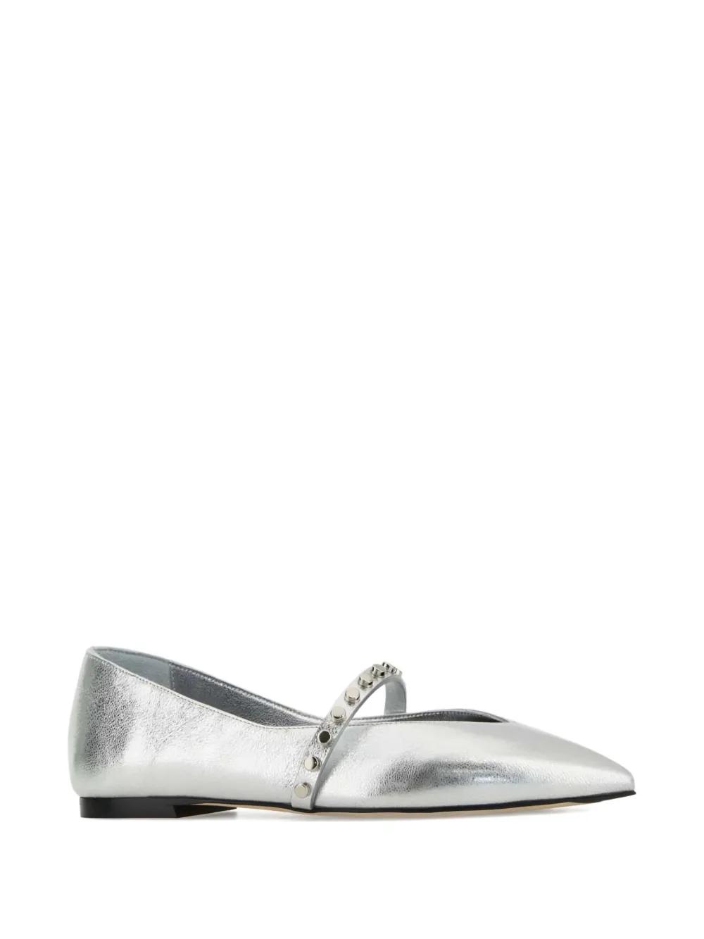 silver leather upper pointed toe v-shaped vamp studded strap flat sole To lessen the environmental impact and to reduce cotton consumption, Alexander McQueen will no longer be providing a dust bag with its sneakers.