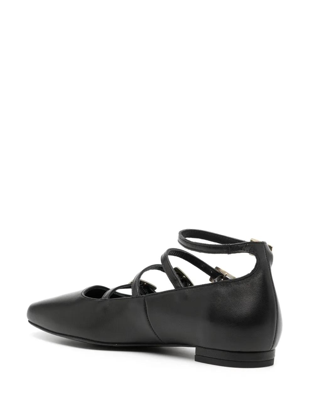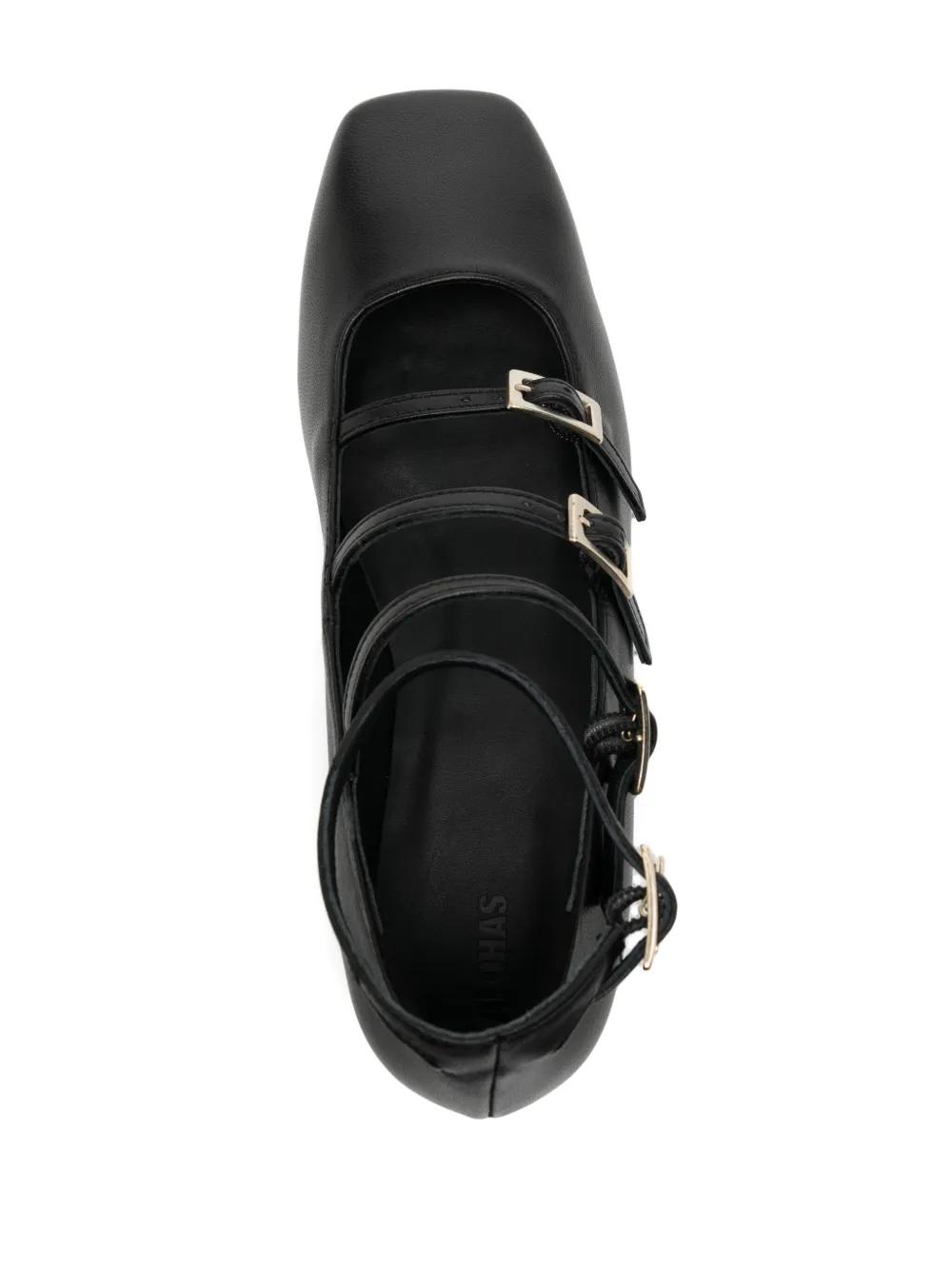 black calf leather double-strap design square toe leather lining gold-tone buckle fastening rubber sole low block heel