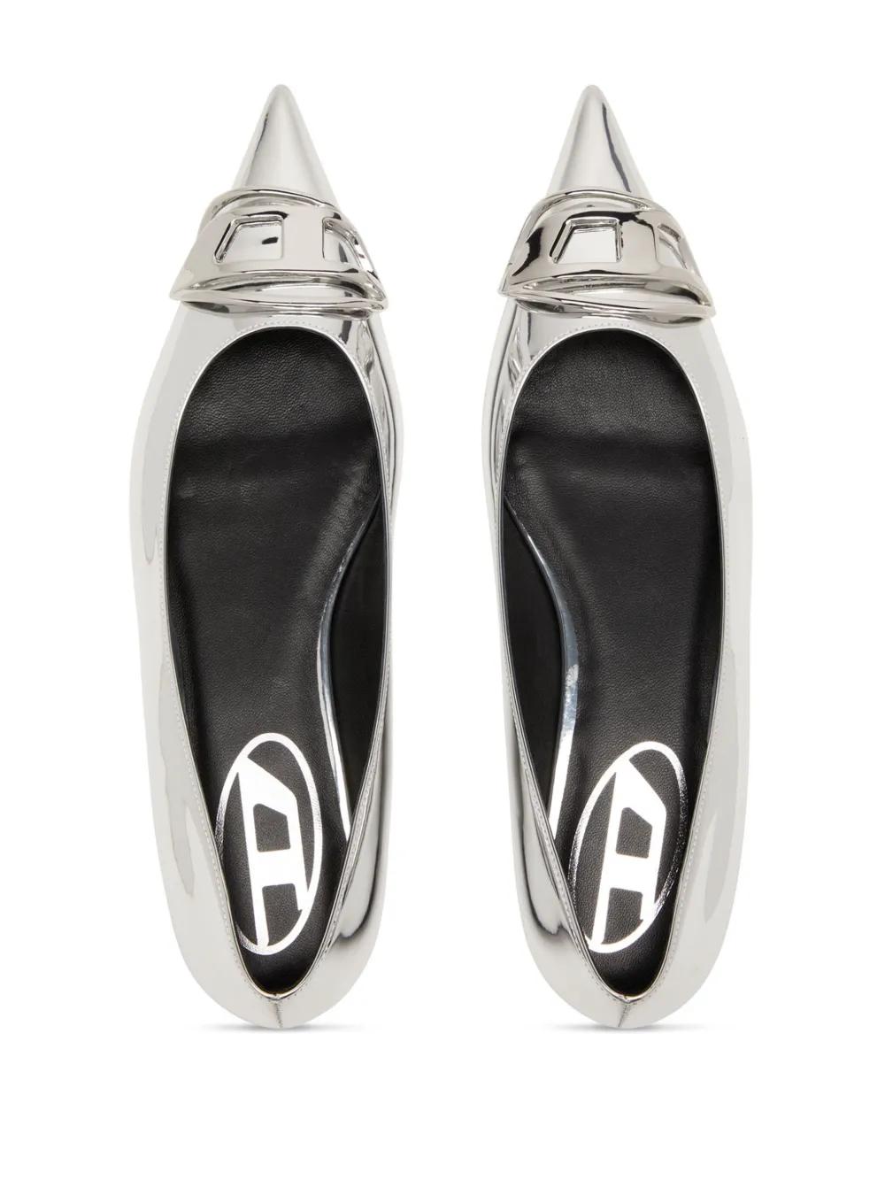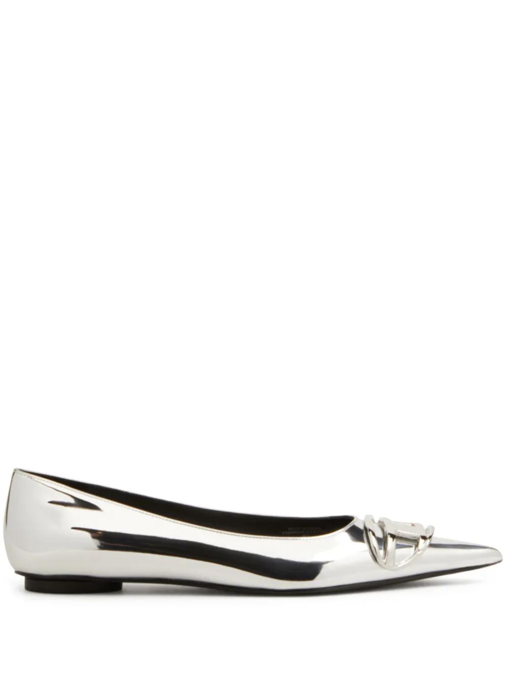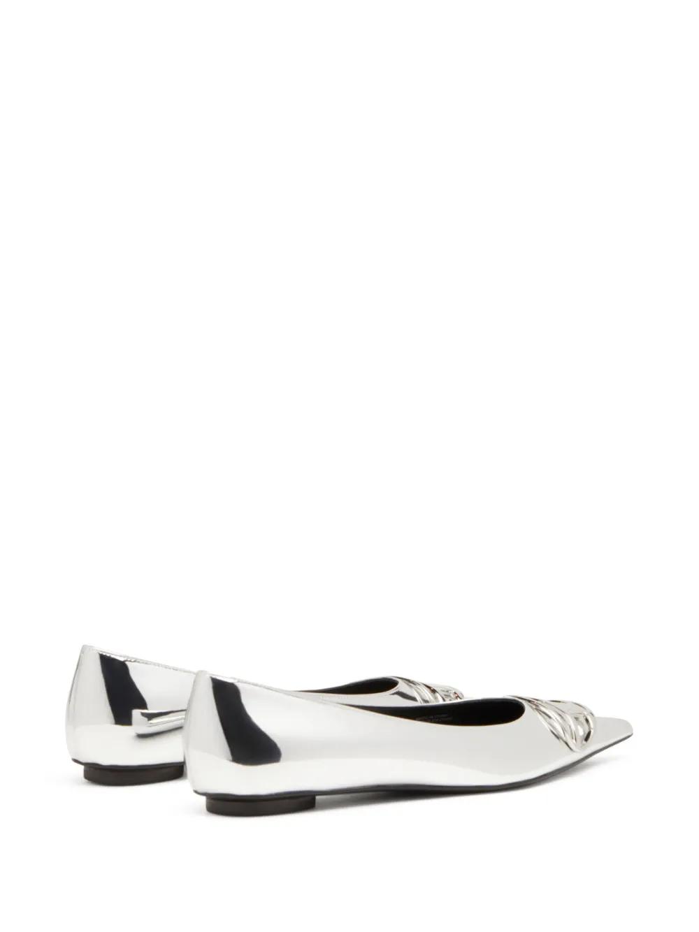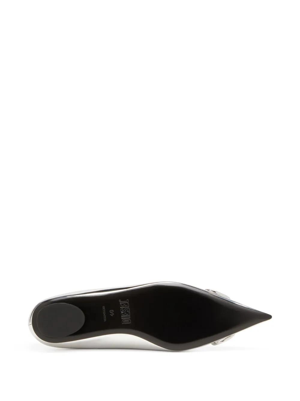 silver-tone calf leather metallic finish logo plaque pointed toe branded leather insole stacked heel flat leather sole slip-on style
