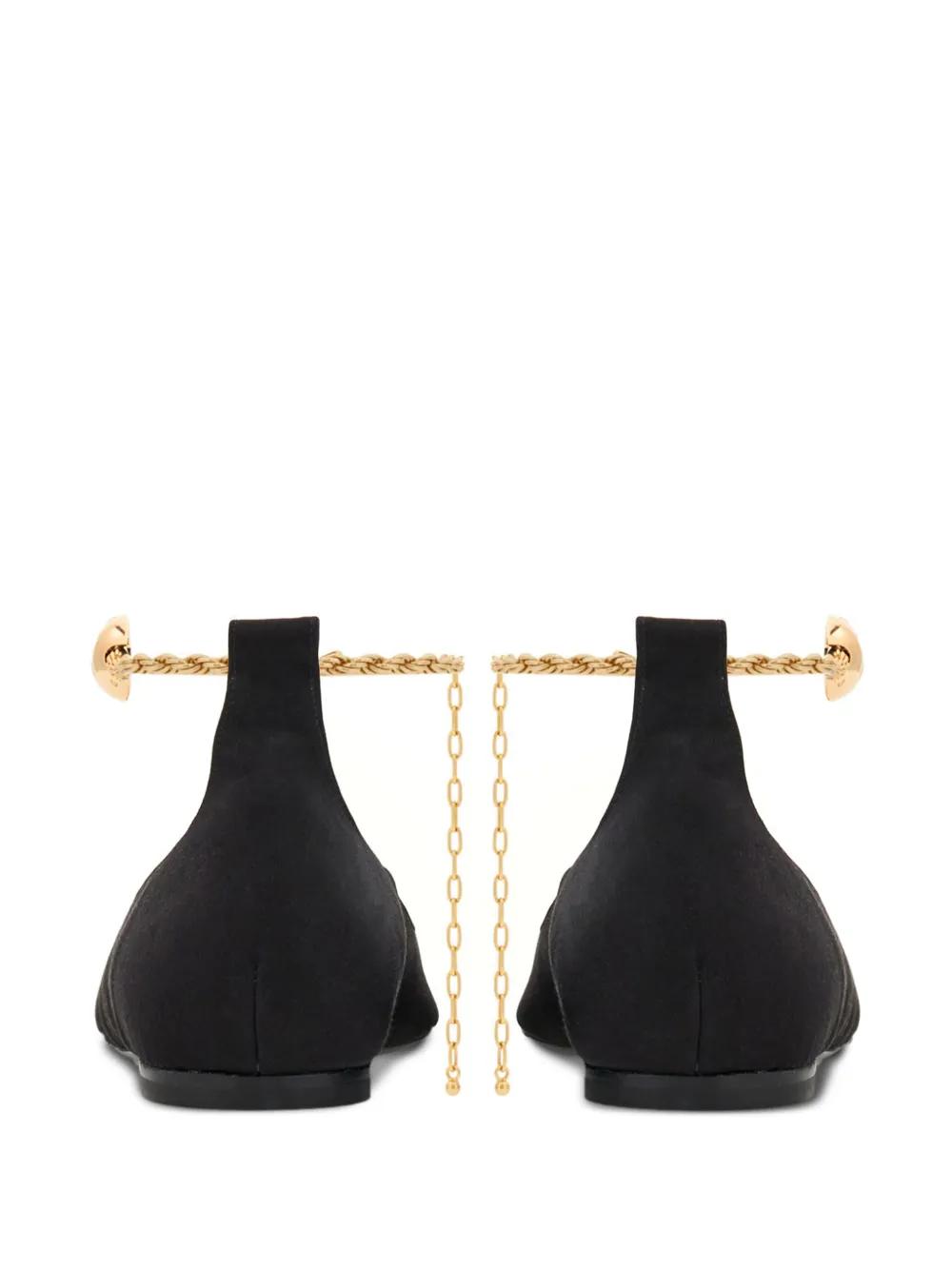 black goatskin gold-tone hardware cable-link chain pointed toe lobster claw fastening branded leather insole flat leather sole