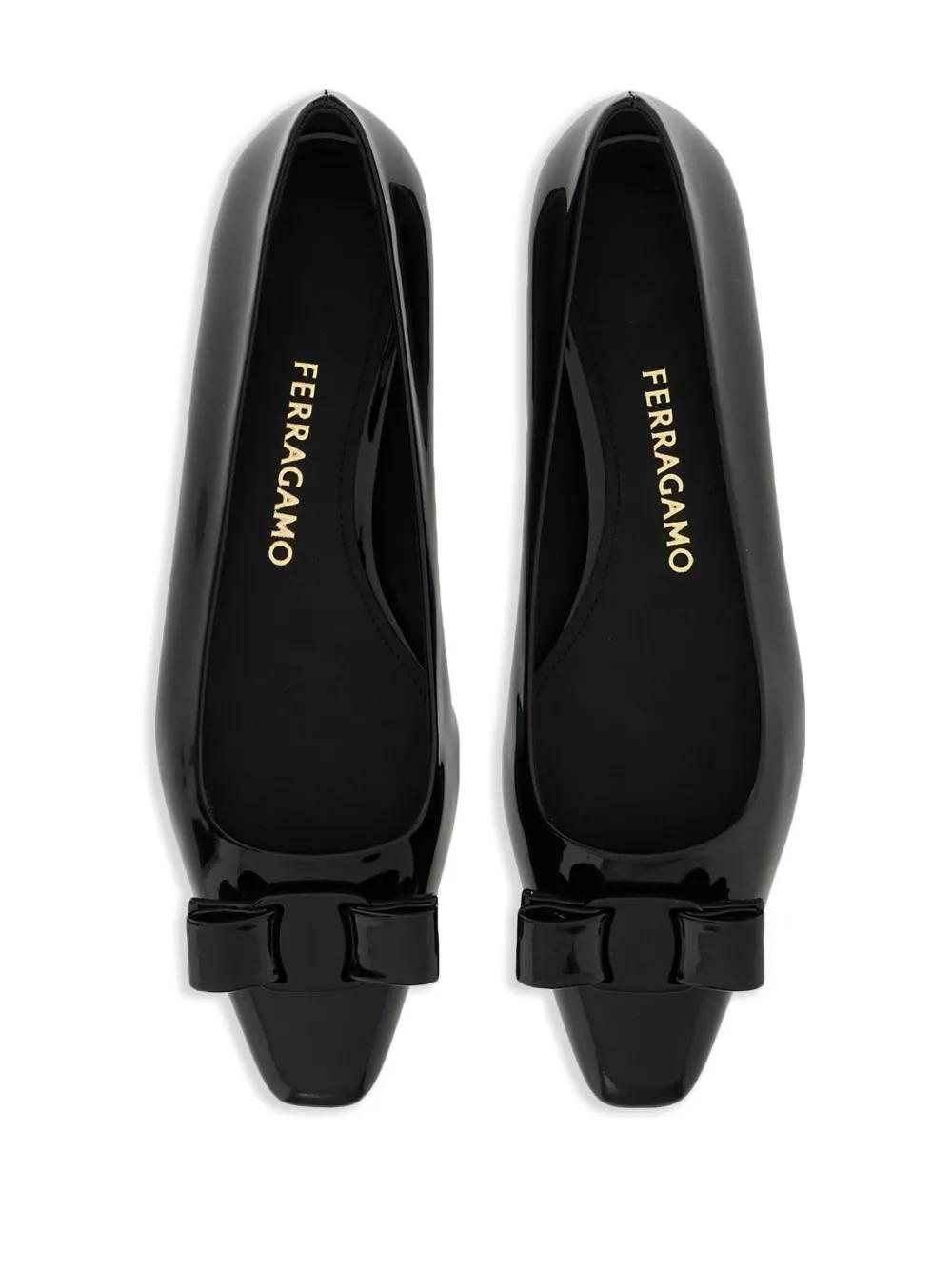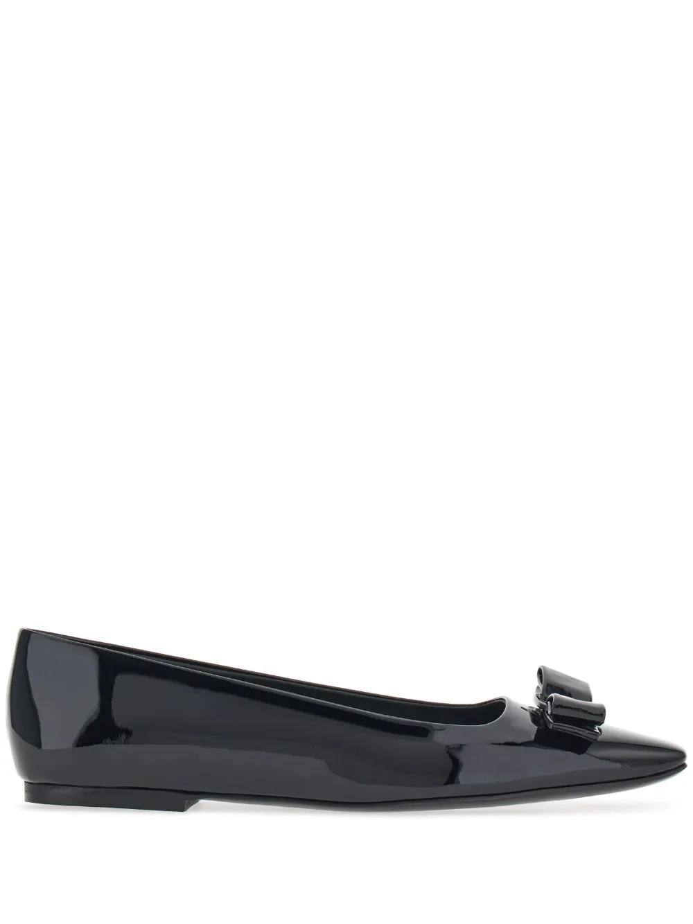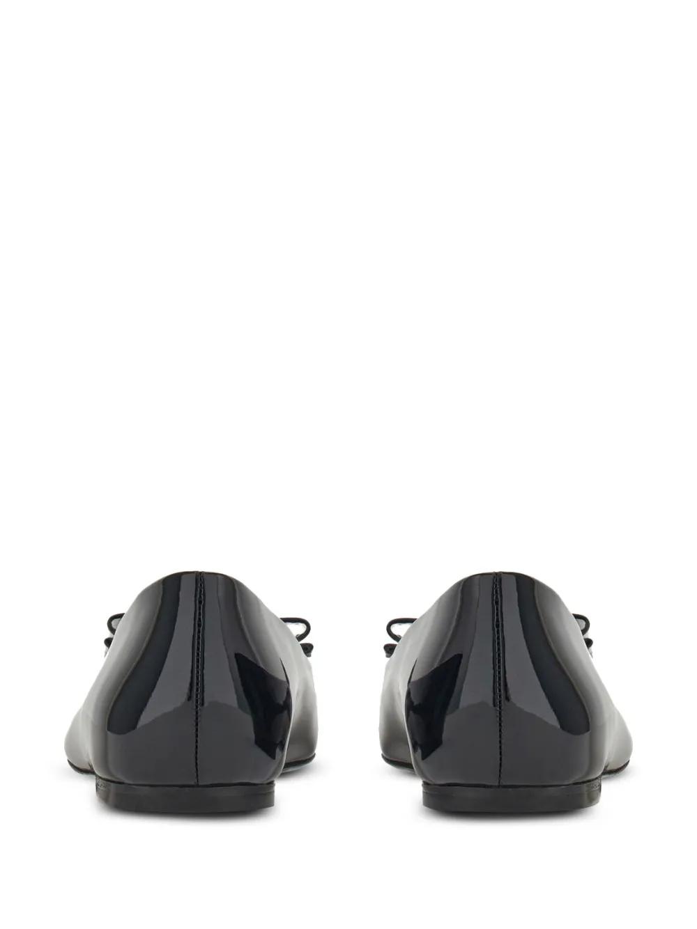 black goatskin patent finish oversize bow detail square toe slip-on style branded insole flat sole