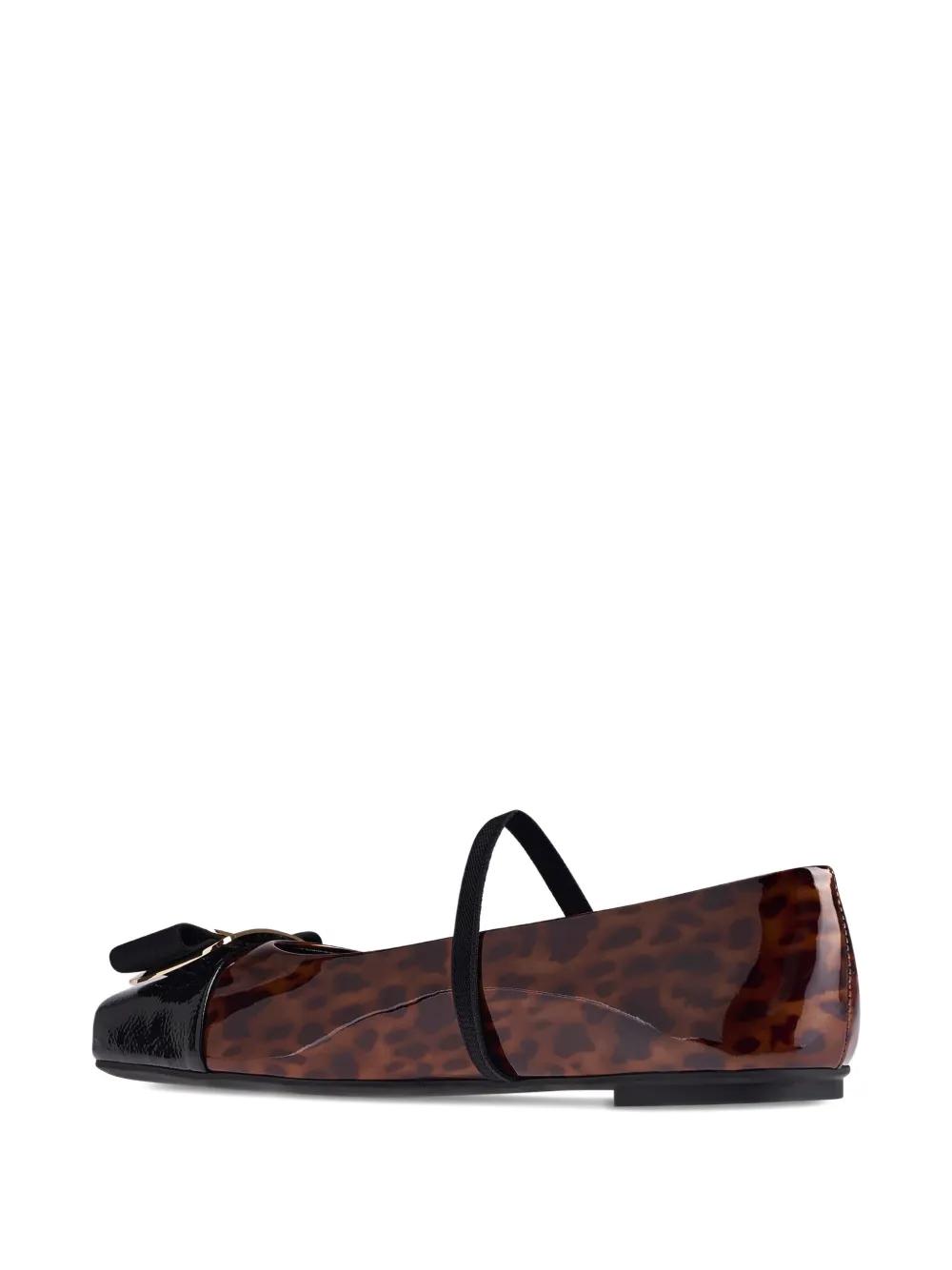 brown tortoiseshell pattern contrasting toecap bow embellishment elasticated strap flat sole