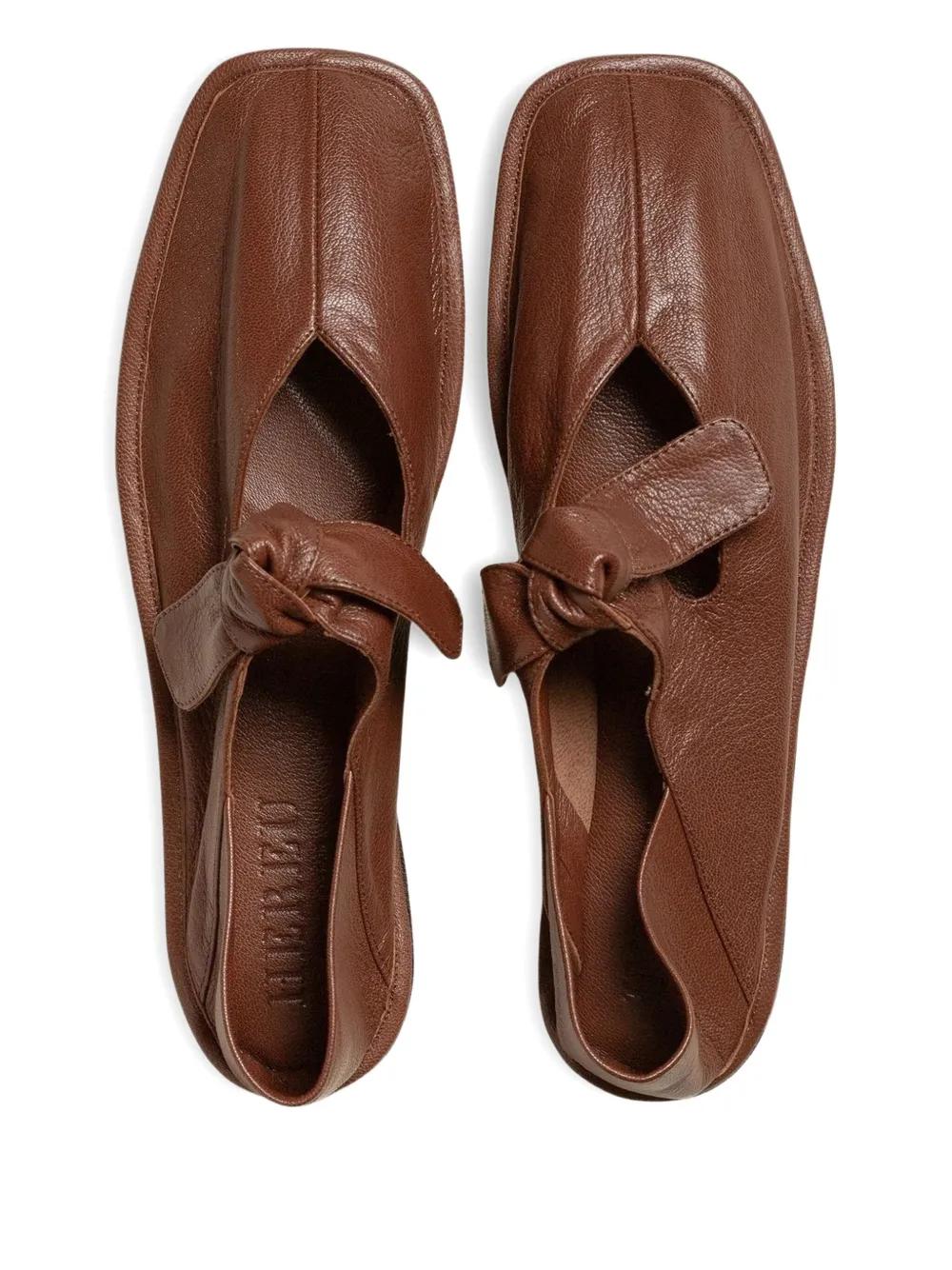 chestnut brown lamb skin knot detail square toe flat sole slip-on style