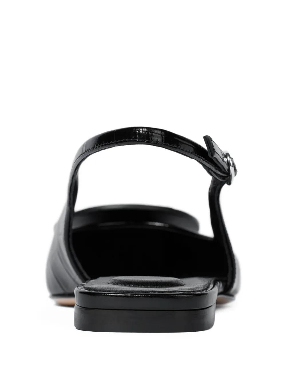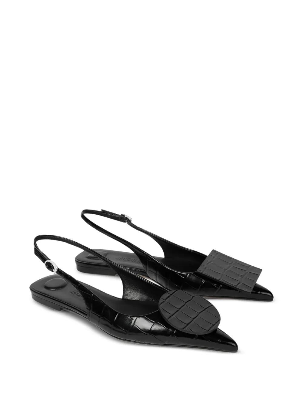 black crocodile-embroidered leather slingback strap buckle fastening square embellishment circle embellishment pointed toe