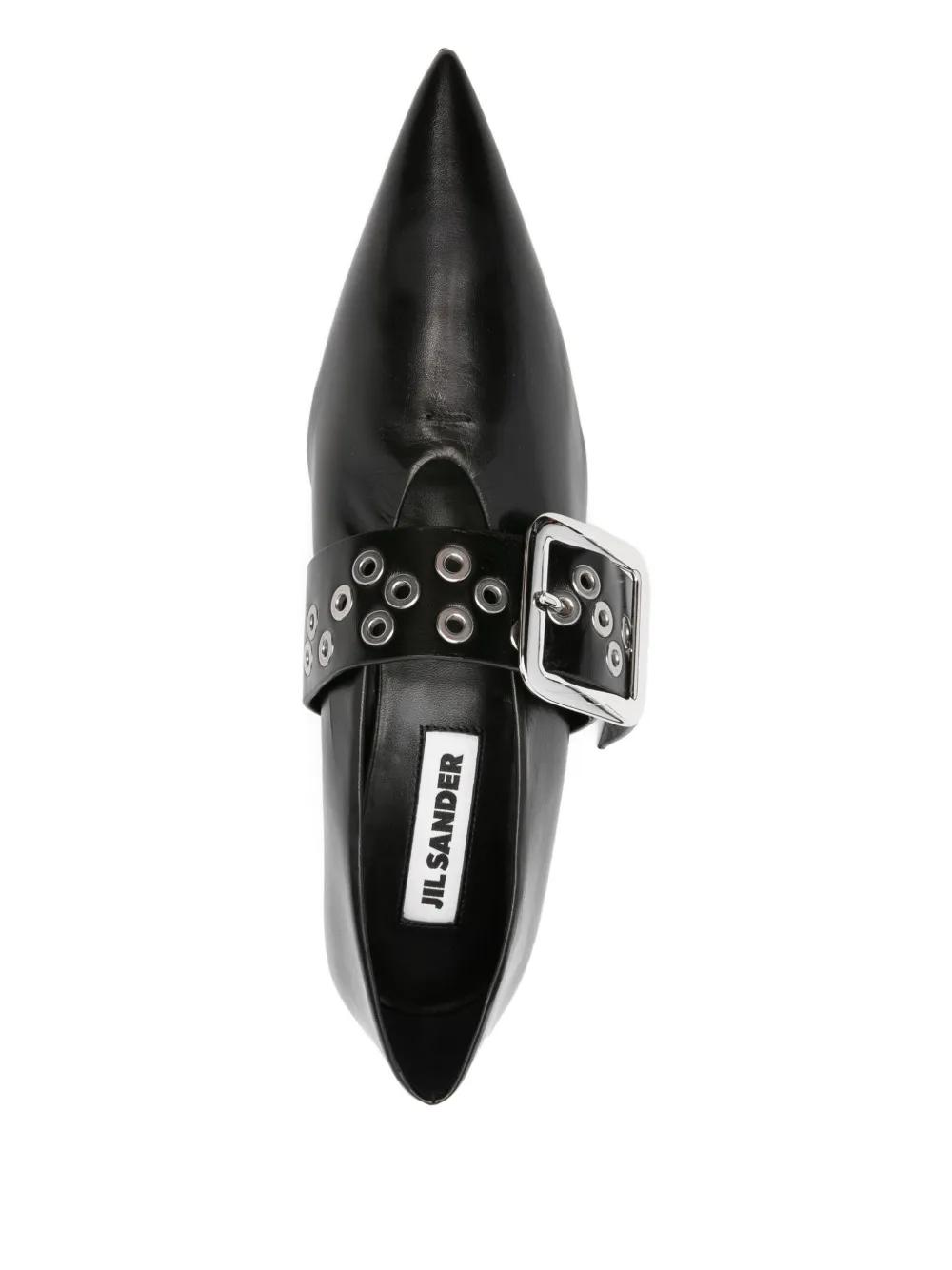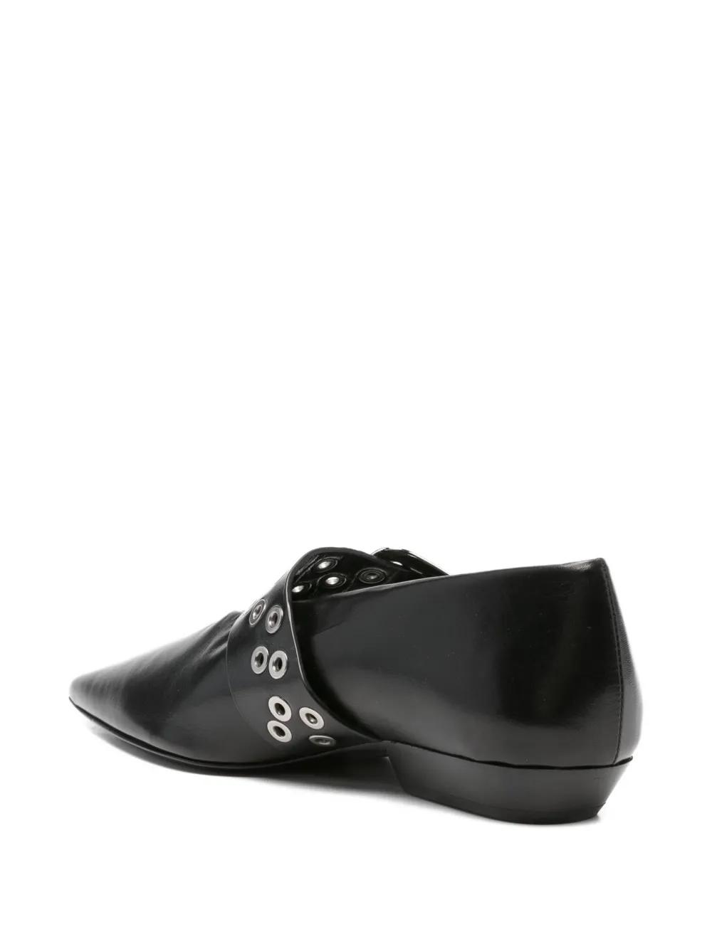 black pointed toe buckle fastening eyelet detail leather upper flat heel