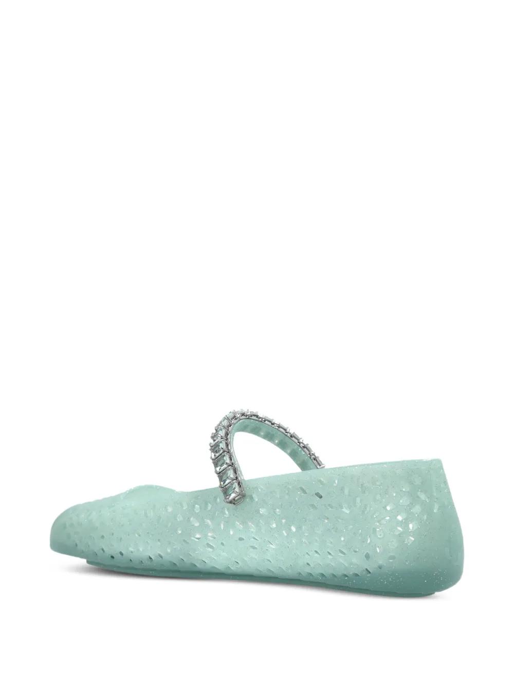 mint green pin fastening flat rubber sole embossed logo to the side rhinestone embellishment