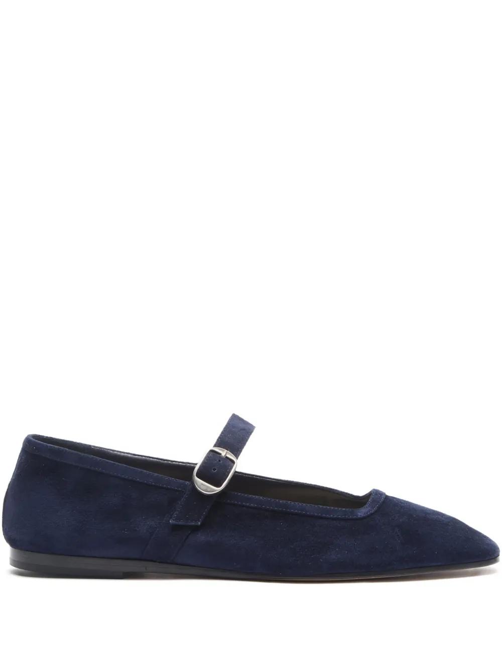 blue suede upper Mary Jane strap buckle fastening flat sole