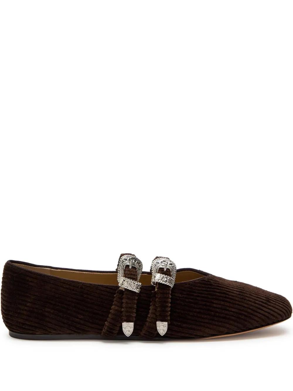 brown corduroy texture double buckle straps silver-tone buckle embellishment square toe flat sole