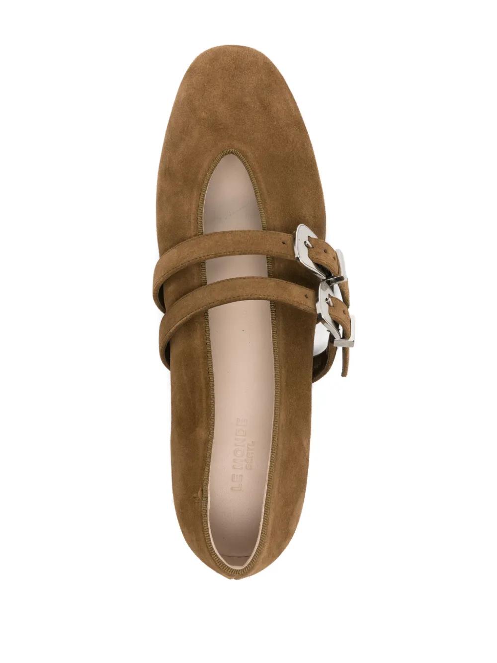 taupe calf suede double buckle fastening almond toe branded leather insole flat leather sole silver-tone hardware