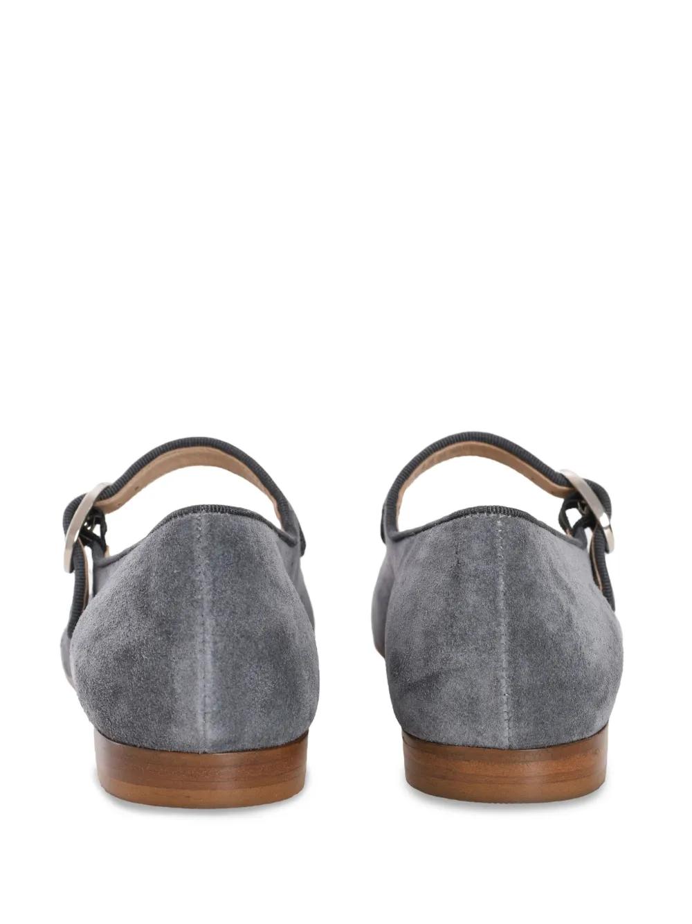 grey suede silver-tone buckle fastening square toe branded leather insole flat sole This piece comes complete with a protective dust bag.