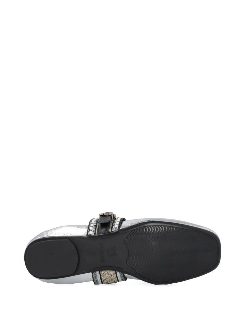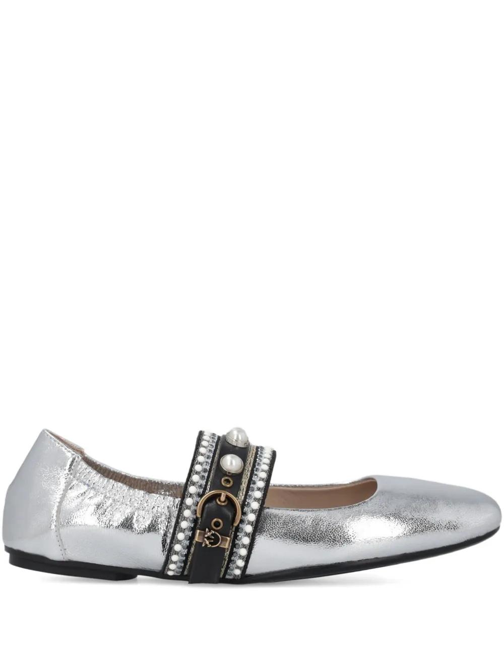 grey calfskin buckle-fastening strap pearl embellishment round toe flat sole