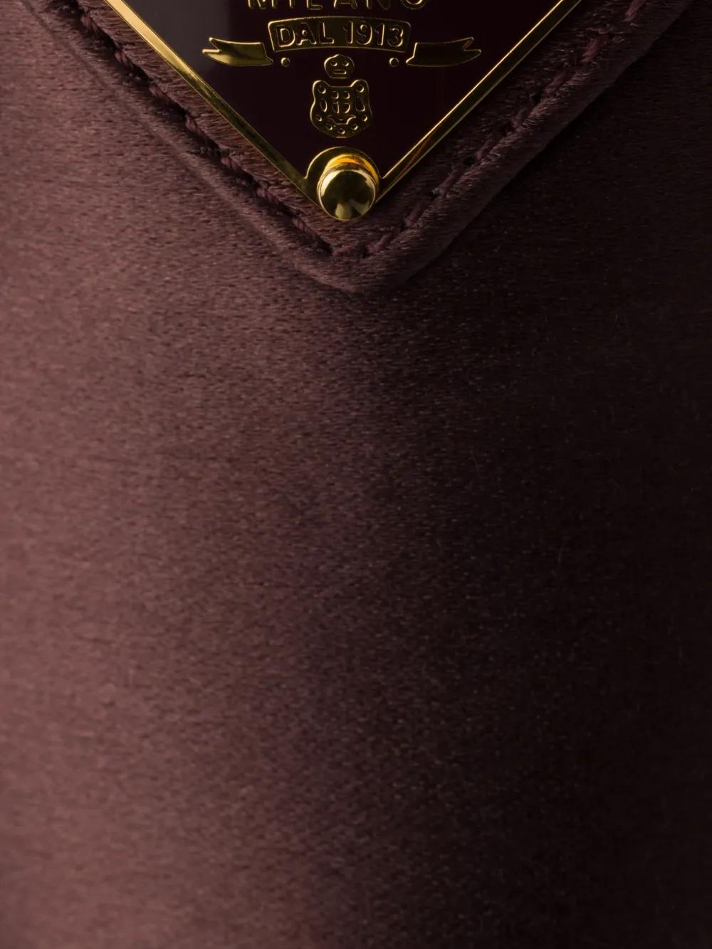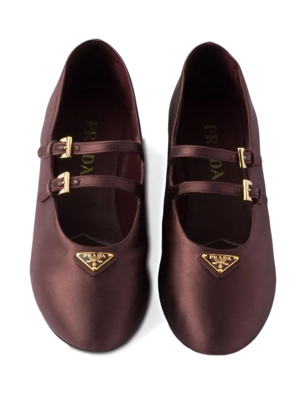 burgundy satin upper double straps metal buckles triangle logo rubber sole