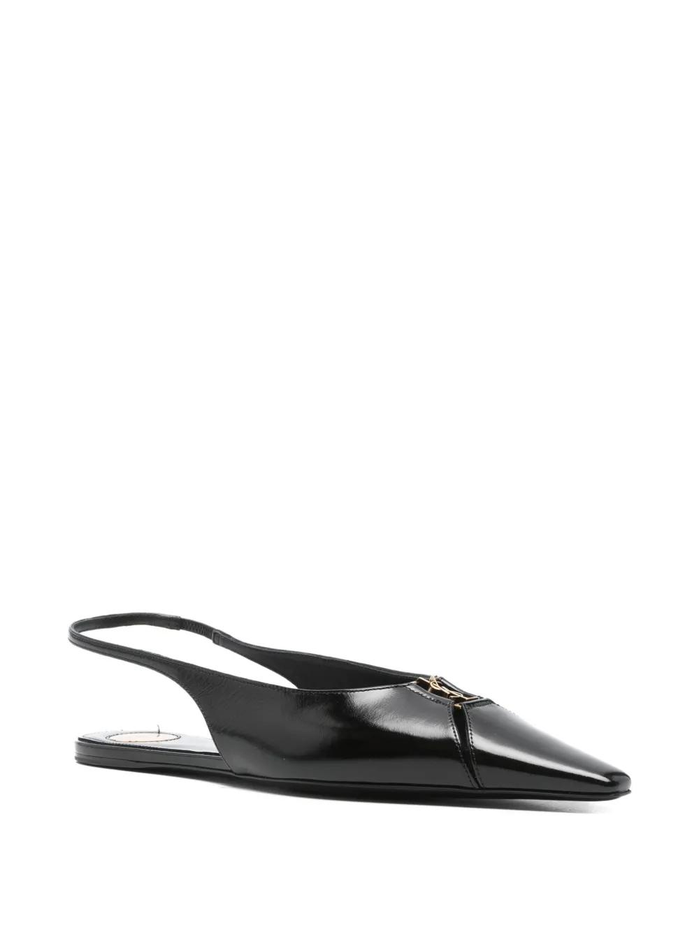 black leather pointed toe slingback strap gold-tone logo flat sole