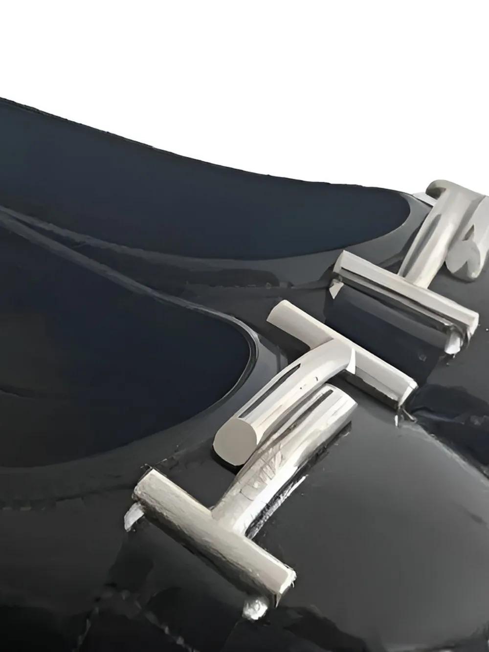 black patent finish silver-tone hardware T-bar detail slip-on style