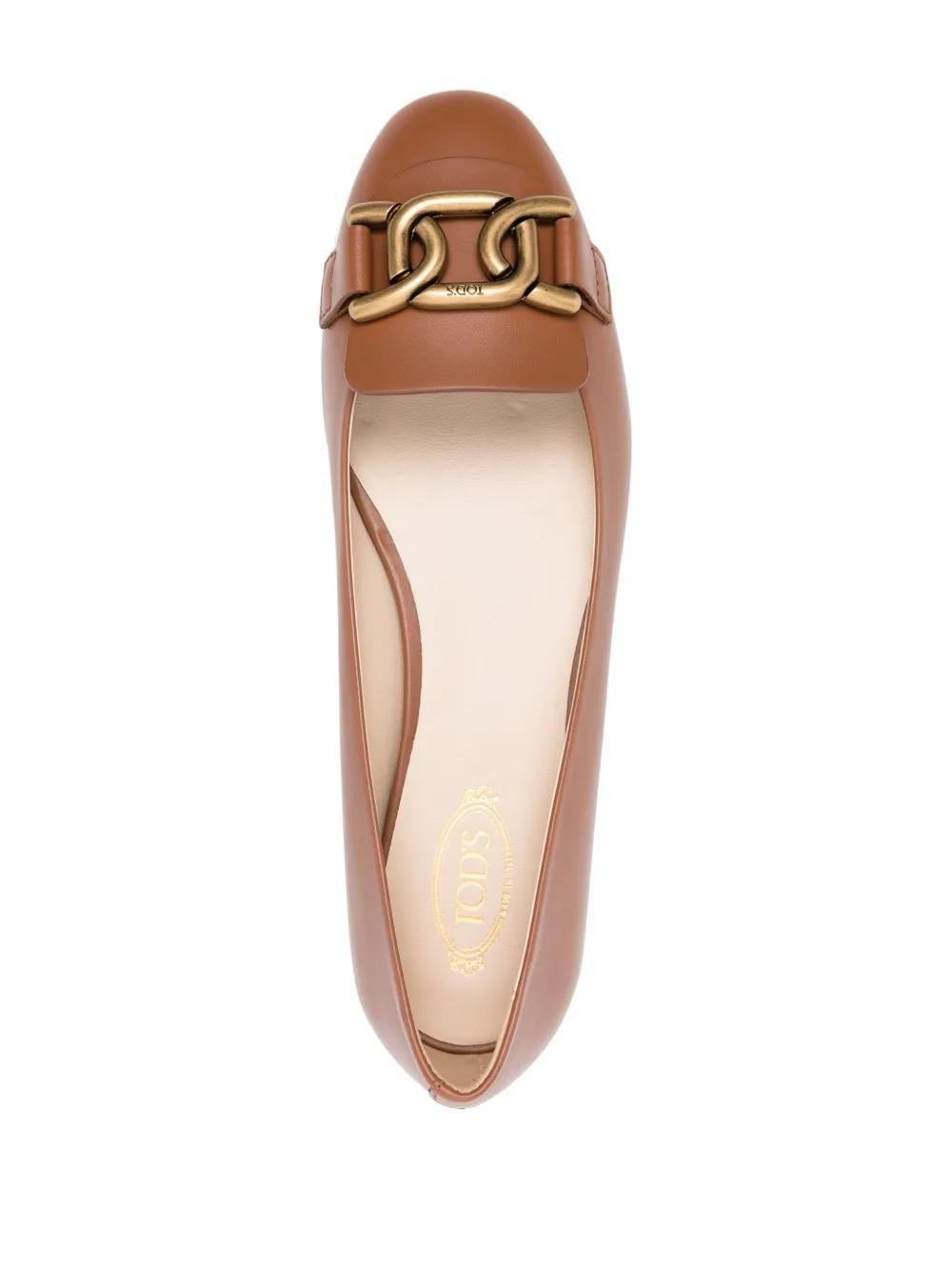 ochre brown calf leather smooth grain logo-engraved antique-effect hardware round toe slip-on style branded leather insole leather sole low block heel