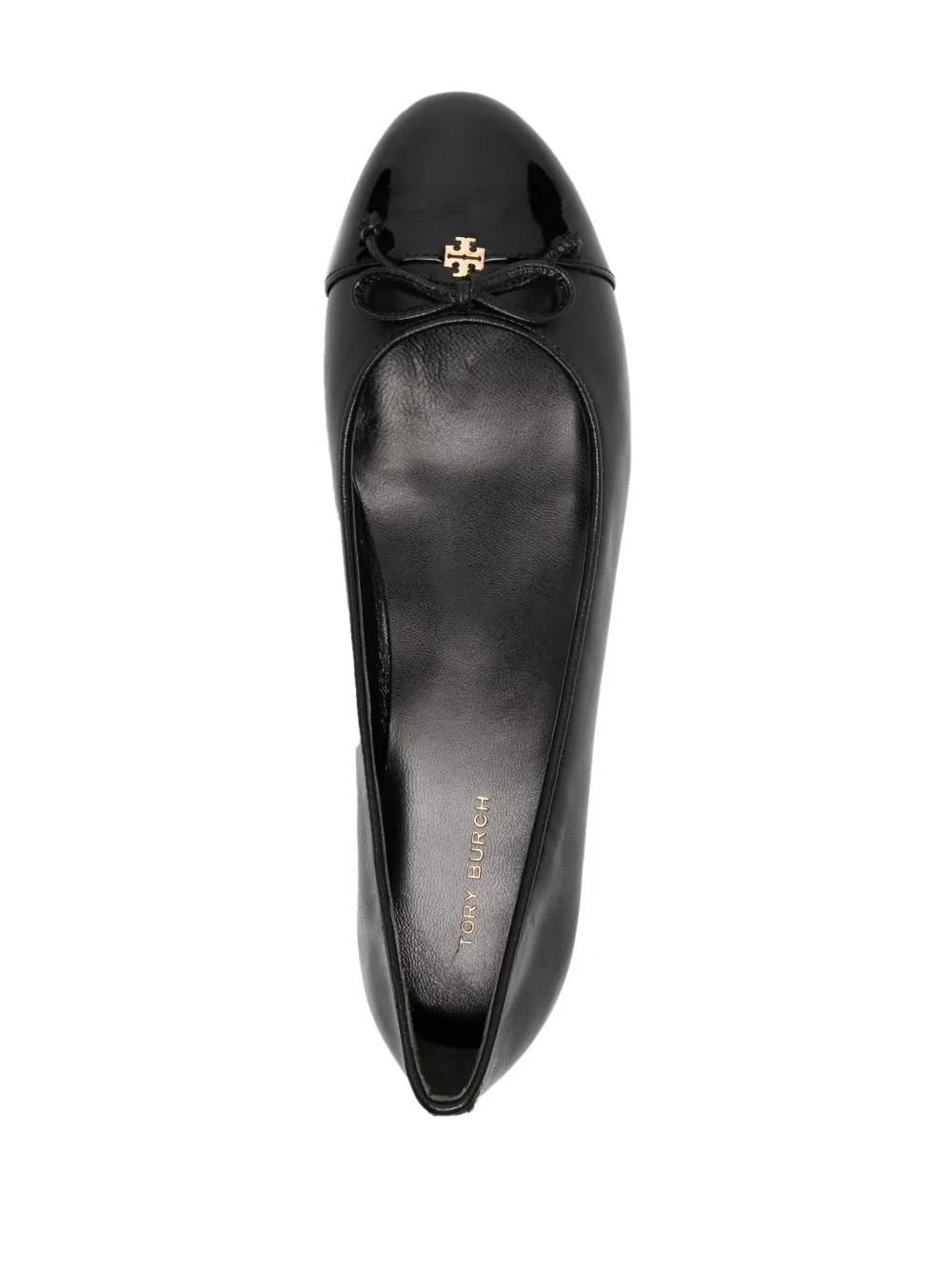 black calf leather/goatskin patent finish signature Double T motif gold-tone logo plaque bow detailing contrasting toecap branded insole slip-on style round toe flat sole