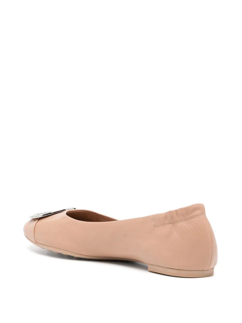 light sand/gold/silver leather gold-tone logo plaque almond toe branded leather insole flat rubber sole