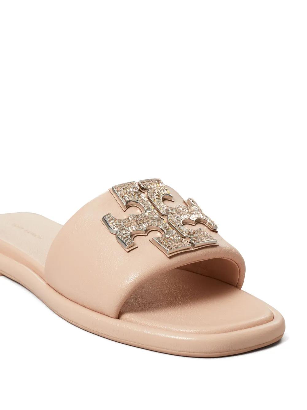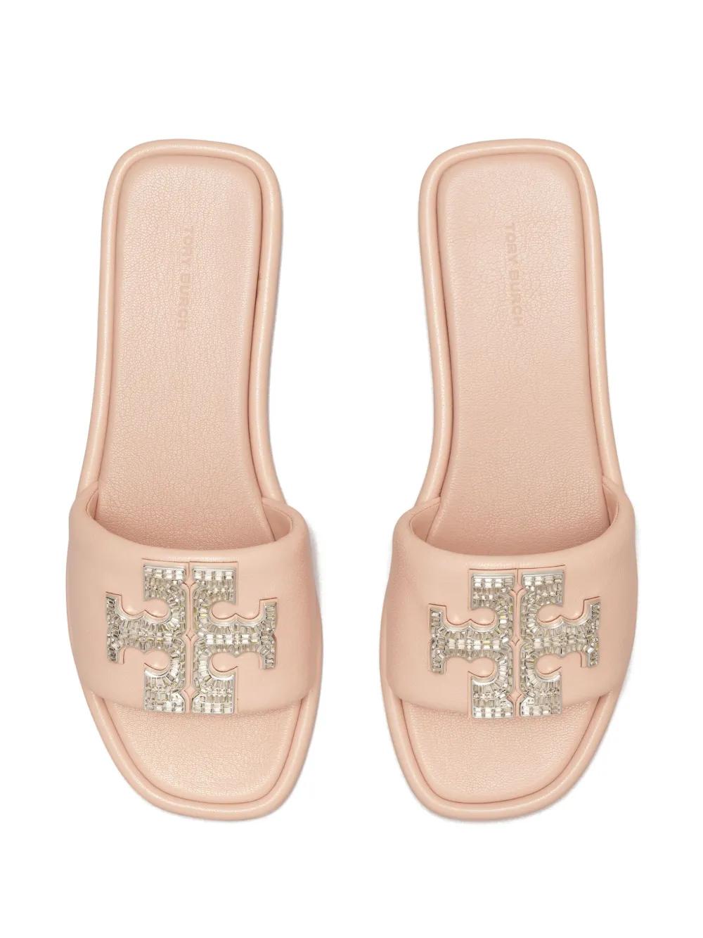 light pink leather pavé embellishment open toe padded design single toe strap branded leather insole rubber sole