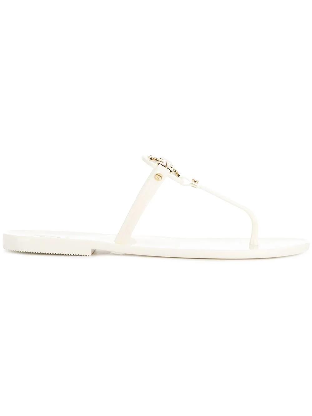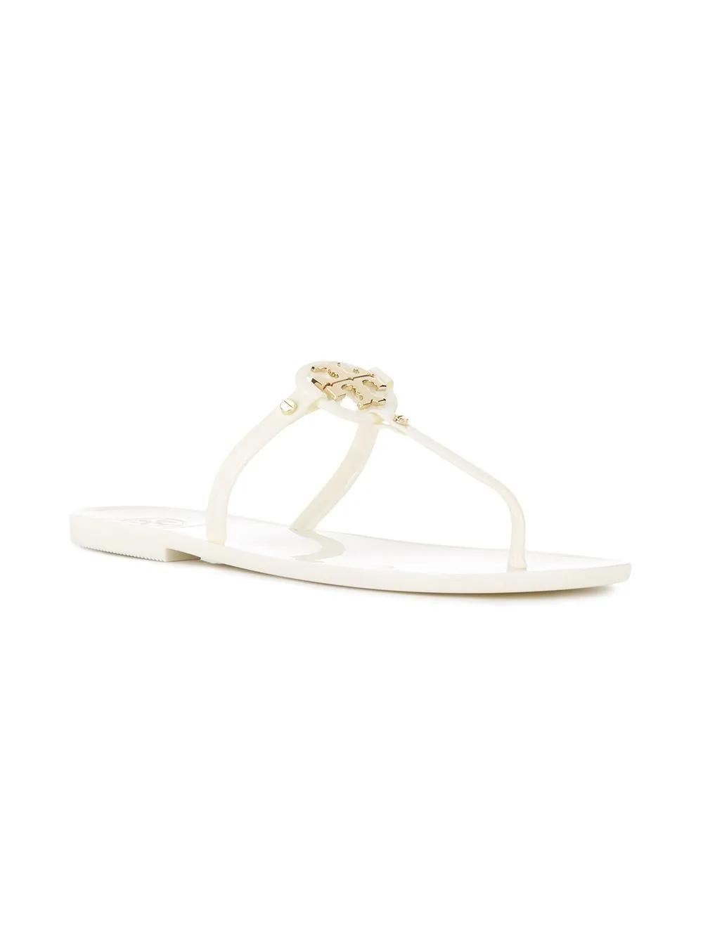 white gold-tone logo plaque gold-tone stud detailing thong strap slip-on style flat rubber sole