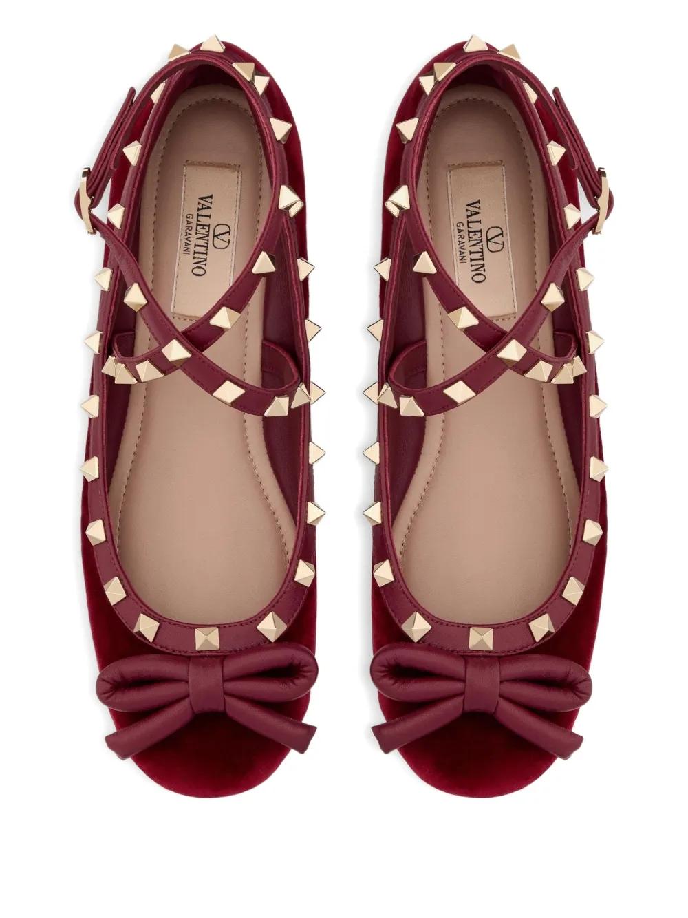 wine red calf leather velvet finish signature Rockstud embellishment bow detailing ankle strap adjustable strap to the side branded insole