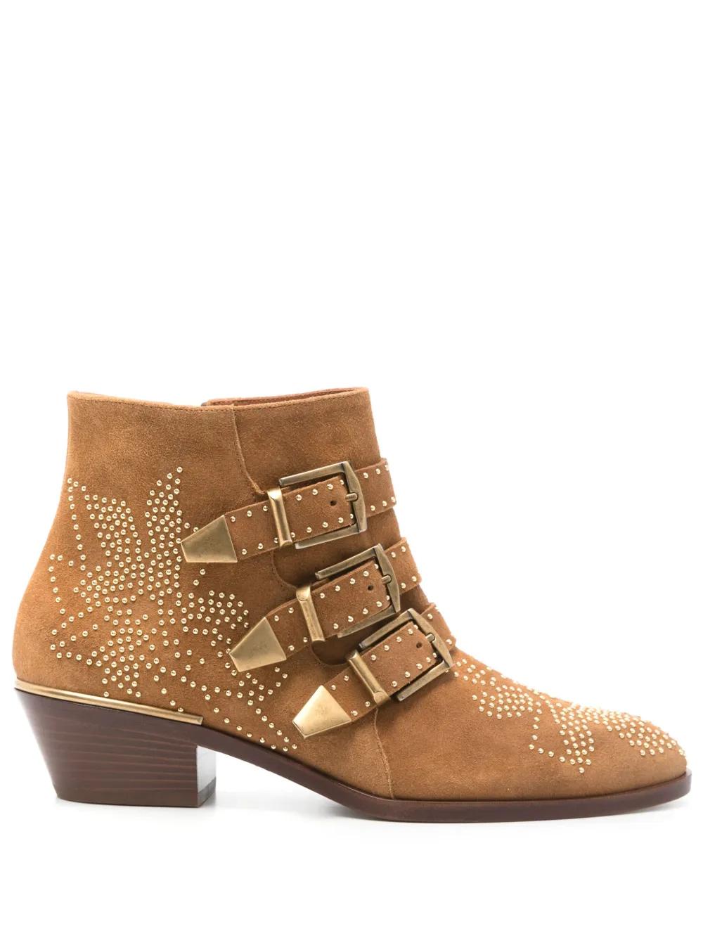 ochre brown side zip fastening Cuban heel stud embellishment decorative buckle detail