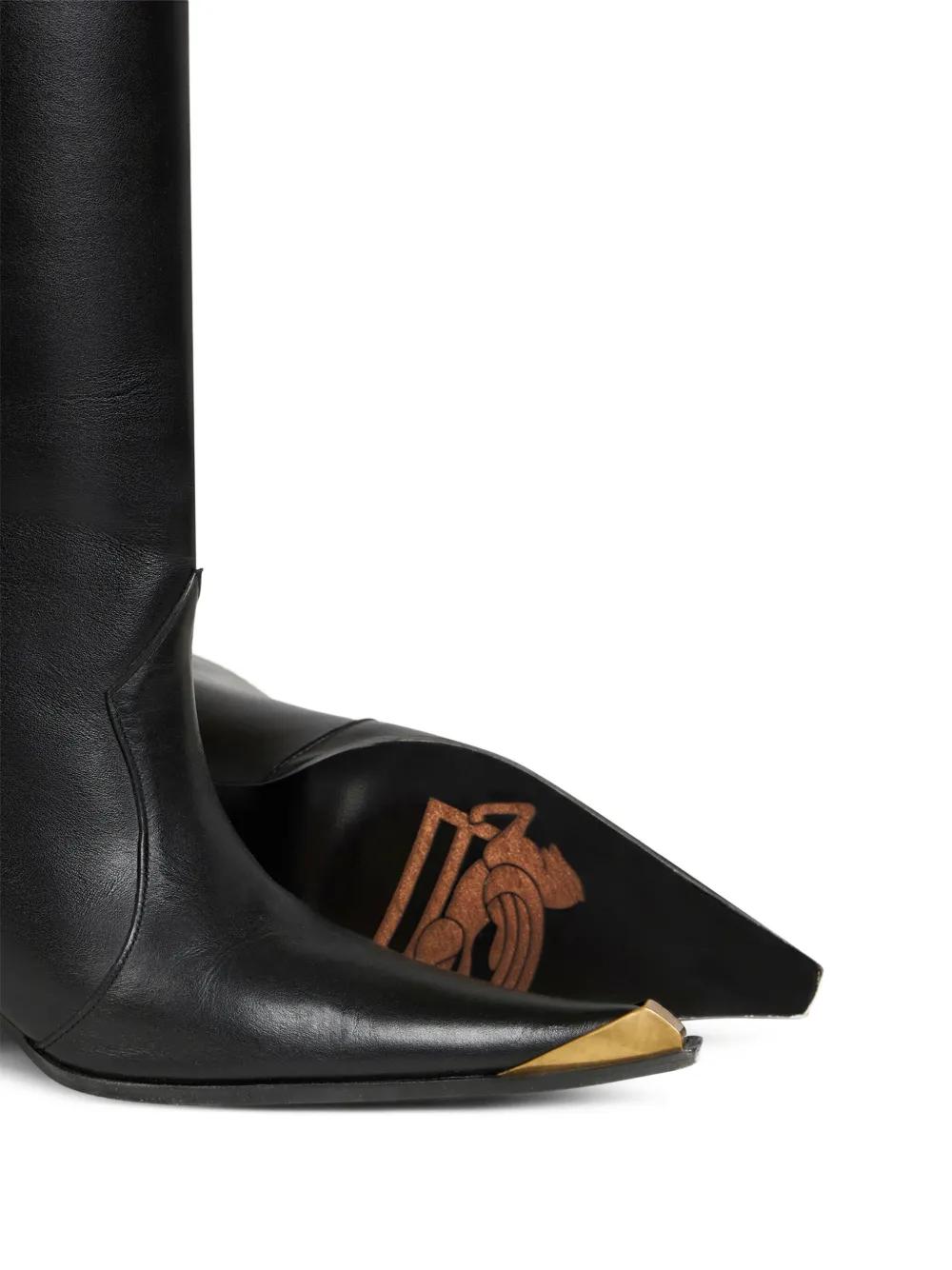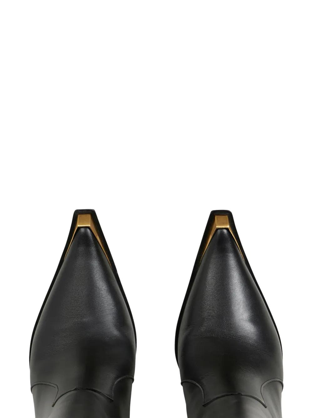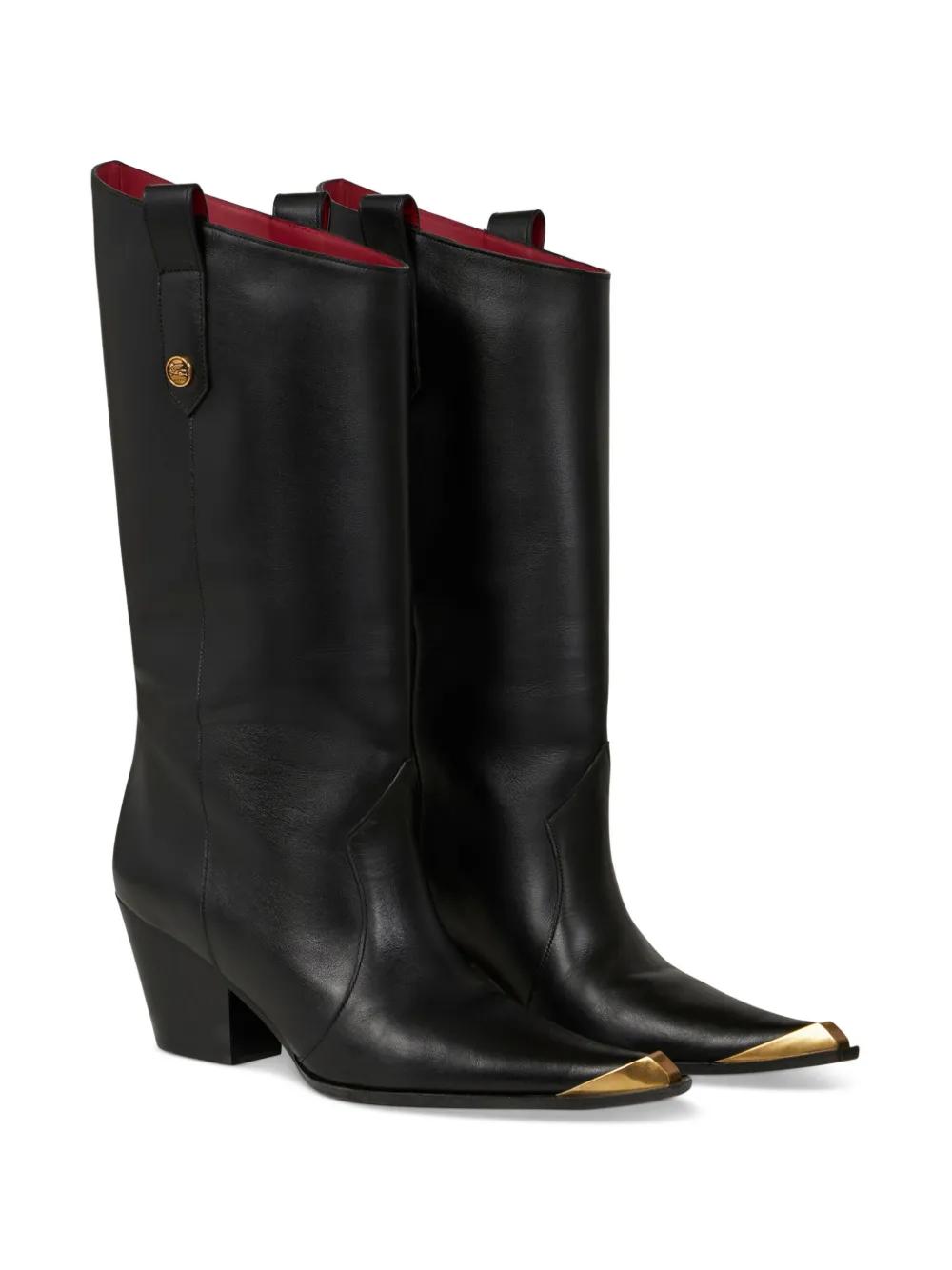 black leather smooth grain pointed toe metal toecap gold-tone hardware signature Pegaso motif mid block heel slip-on style