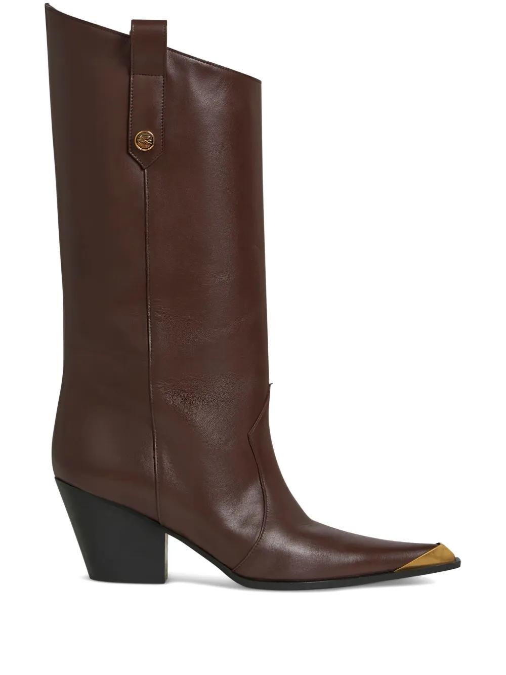 brown leather smooth grain pointed toe metal toecap gold-tone hardware signature Pegaso motif mid block heel slip-on style