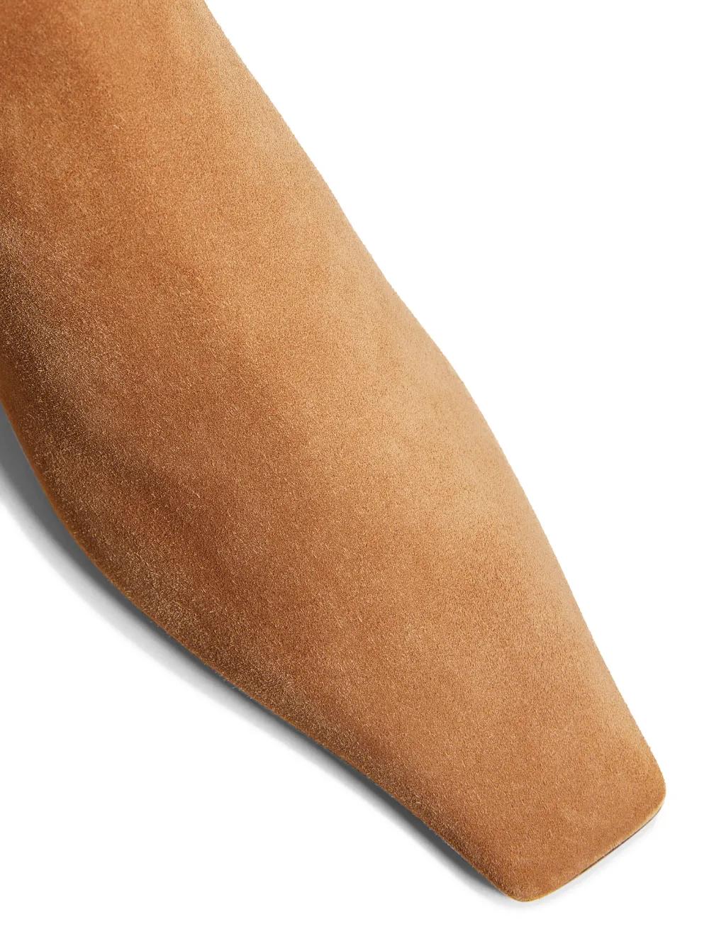 brown calf suede slip-on style low block heel square pointed toe leather lining knee-length