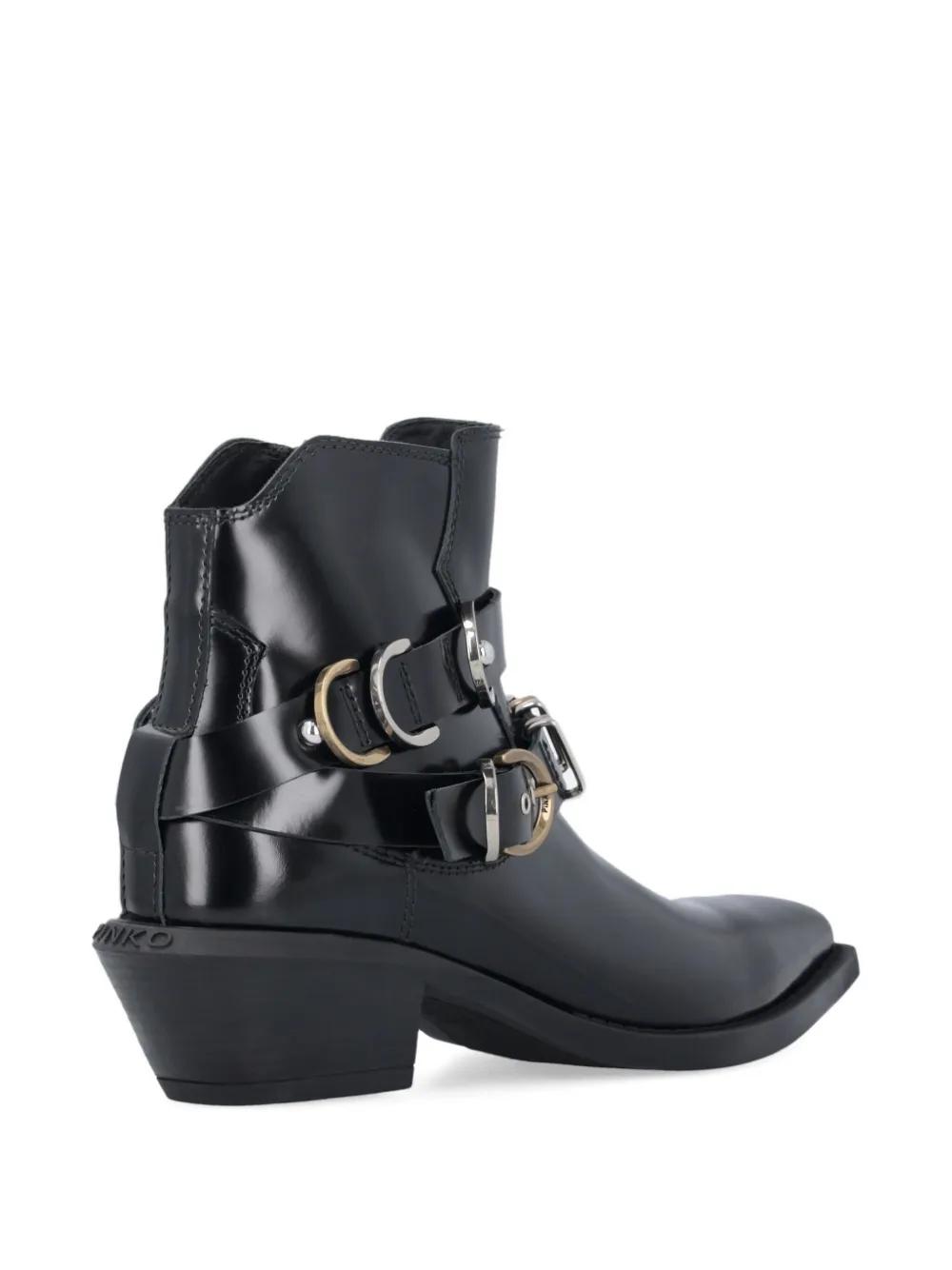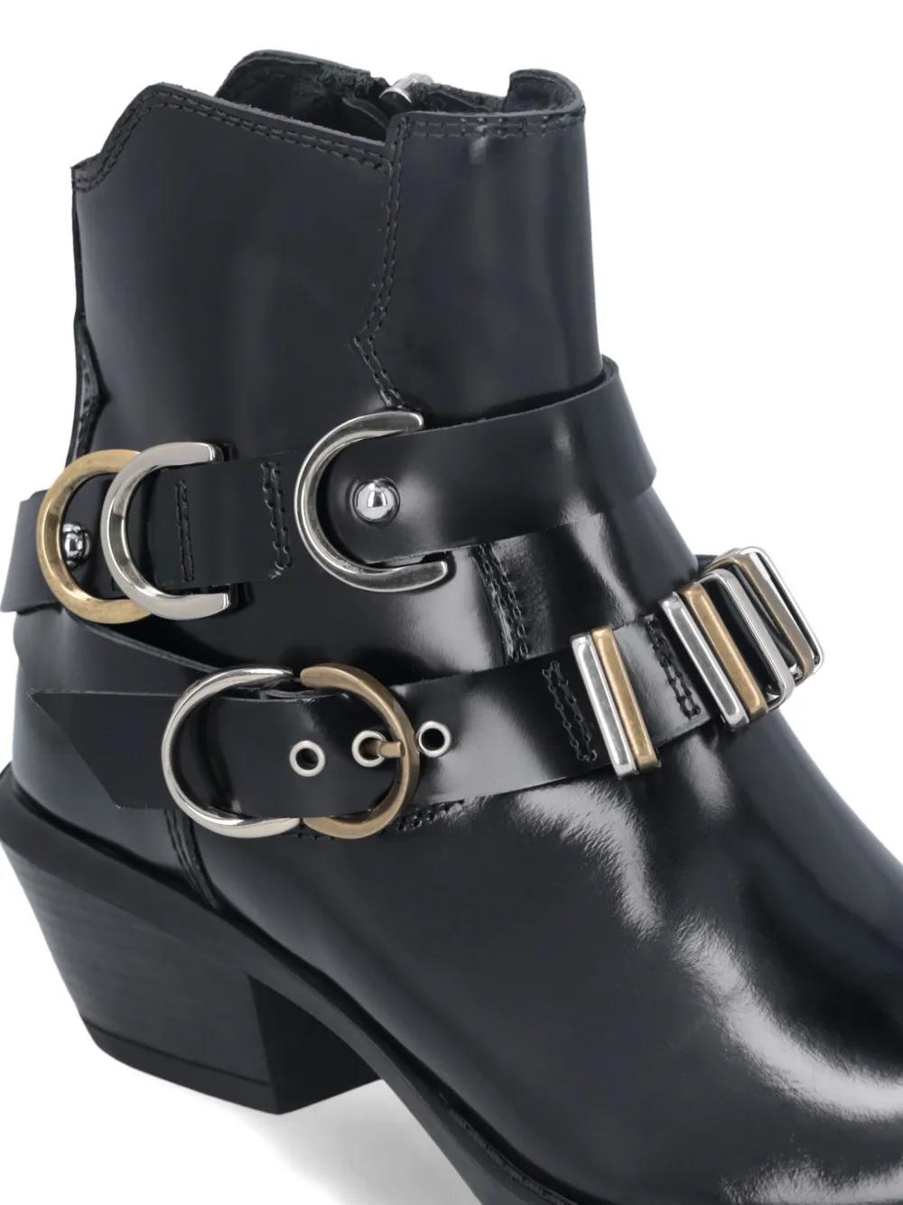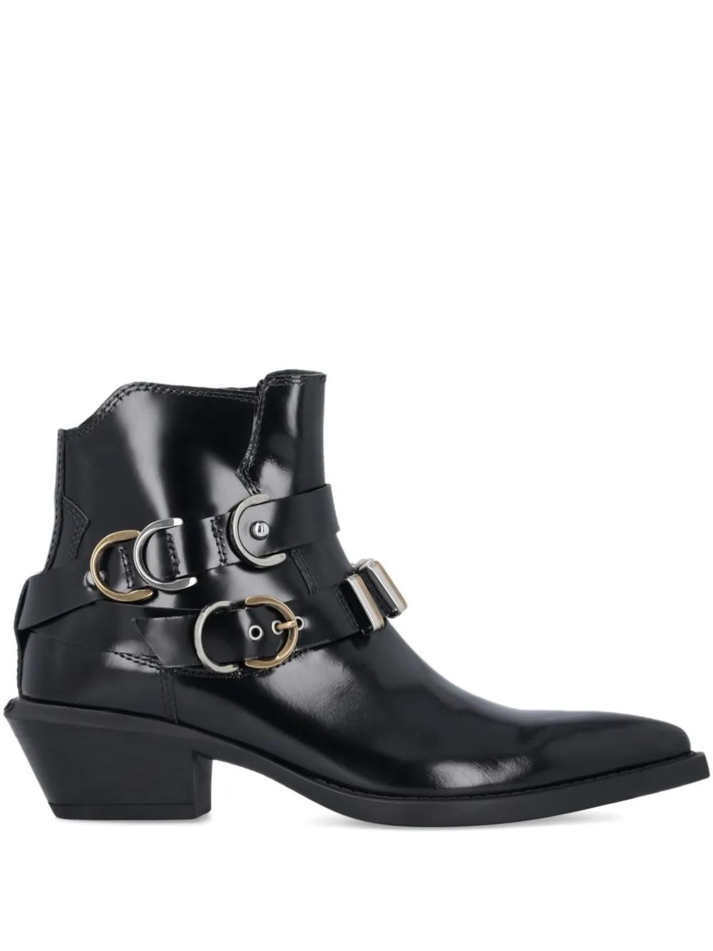 black calfskin buckle-strap pointed toe block heel zip fastening