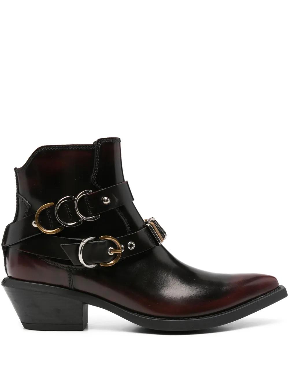 berry red pointed toe multiple buckle straps low Cuban heel side zip fastening