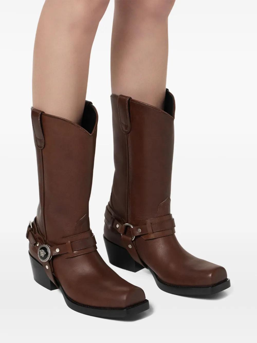 brown high shaft silver-tone buckle detail contrasting stitching square toe stacked heel
