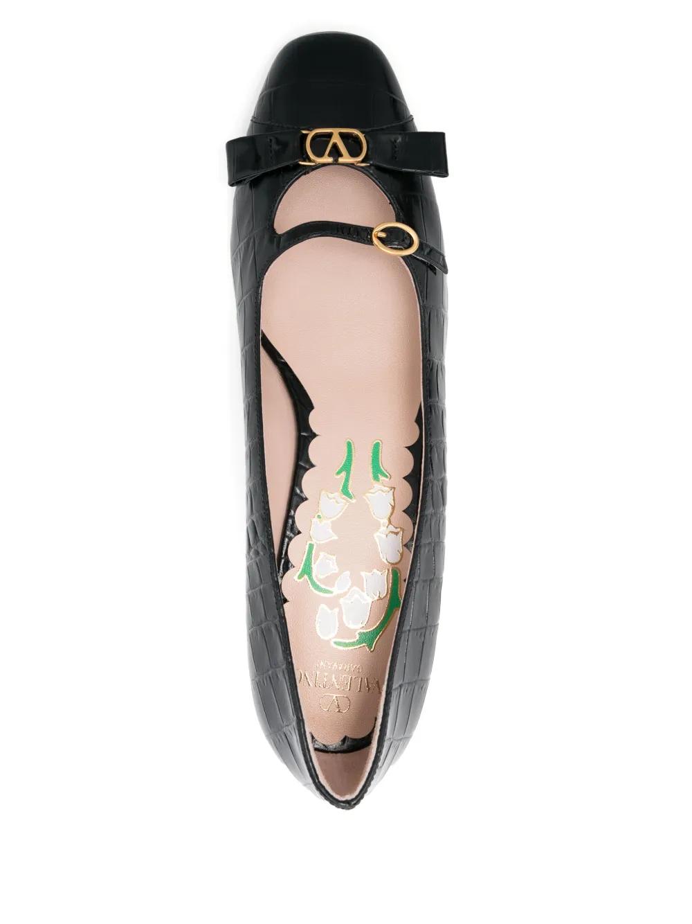 black single toe strap low block heel signature V logo plaque embossed crocodile effect